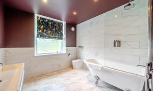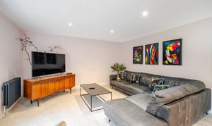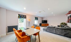 The heart of the property is its expansive, light-filled reception room, ideal for both relaxation and entertaining. A sleek, modern kitchen with adjoining utility room provides excellent storage and functionality, making everyday living effortless. The accommodation includes two generous double bedrooms, one of which benefits from a charming en-suite shower room, while the other is served by a spacious family bathroom featuring double sinks and an over-bath shower — perfect for both practicality and luxury.