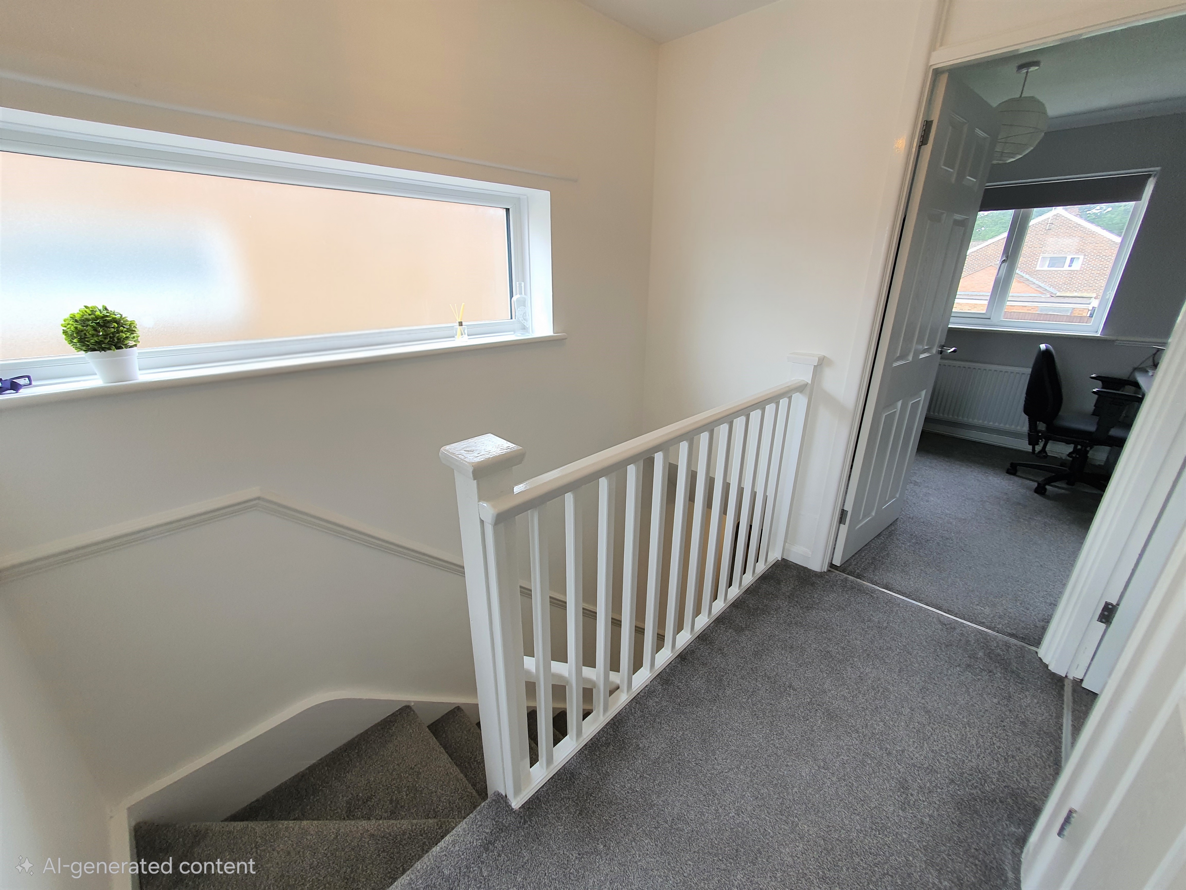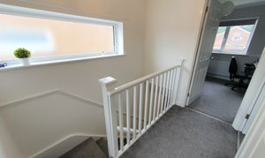 Stairs to first floor and doors to all rooms, with storage under stairs.