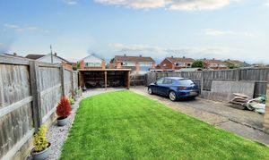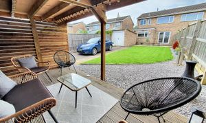 Rear Garden laid to lawn area, driveway and single garage and lovely patio area. There is also a covered area which can be used for entertaining. This is a lovely outside space to enjoy