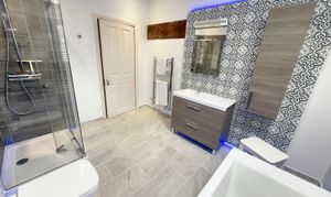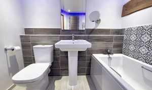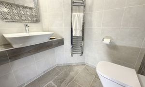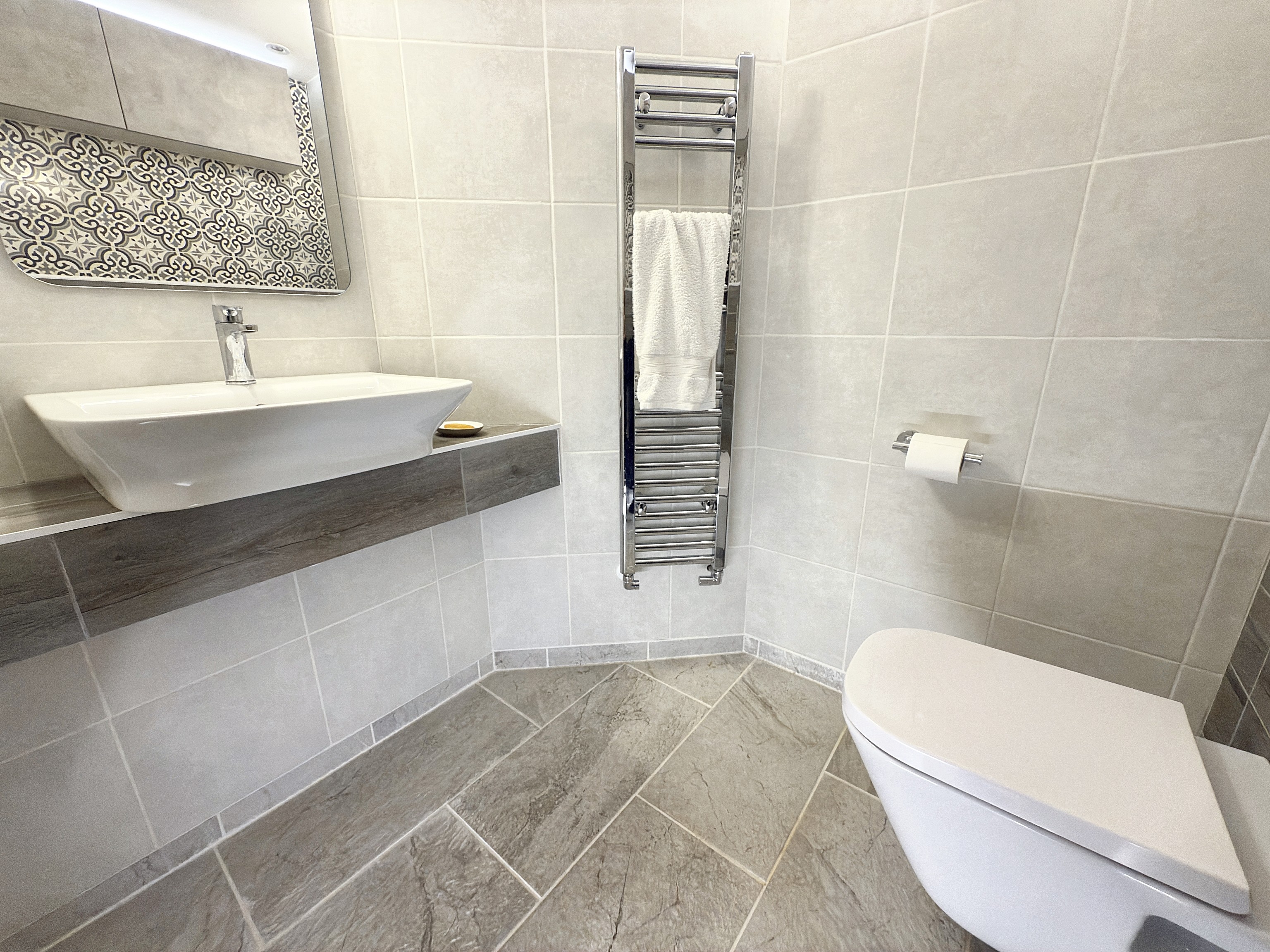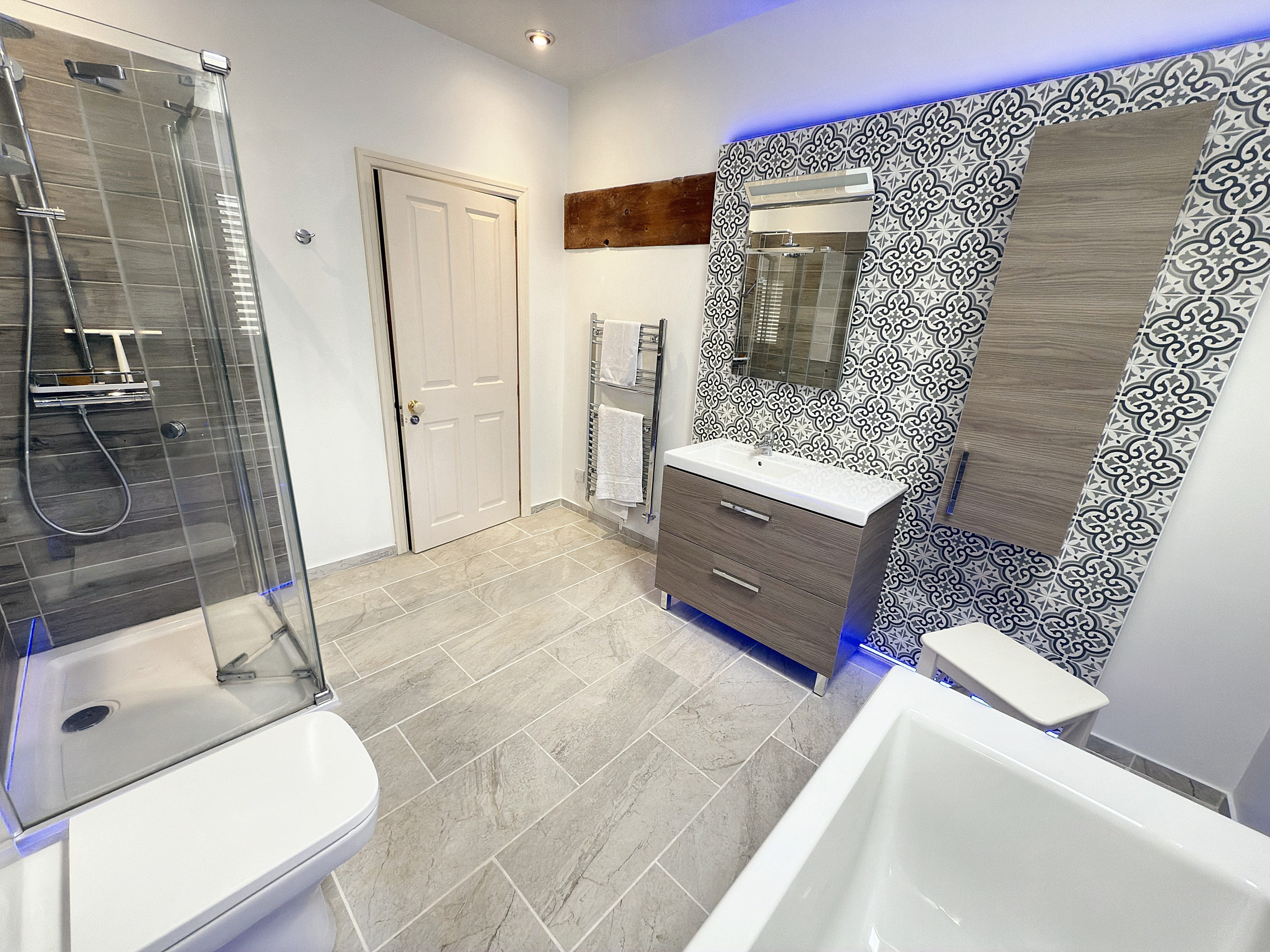 The family bathroom is generously sized and includes a separate shower for convenience.