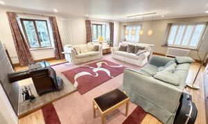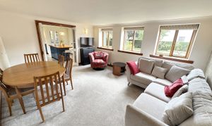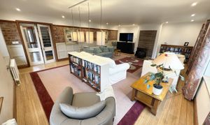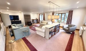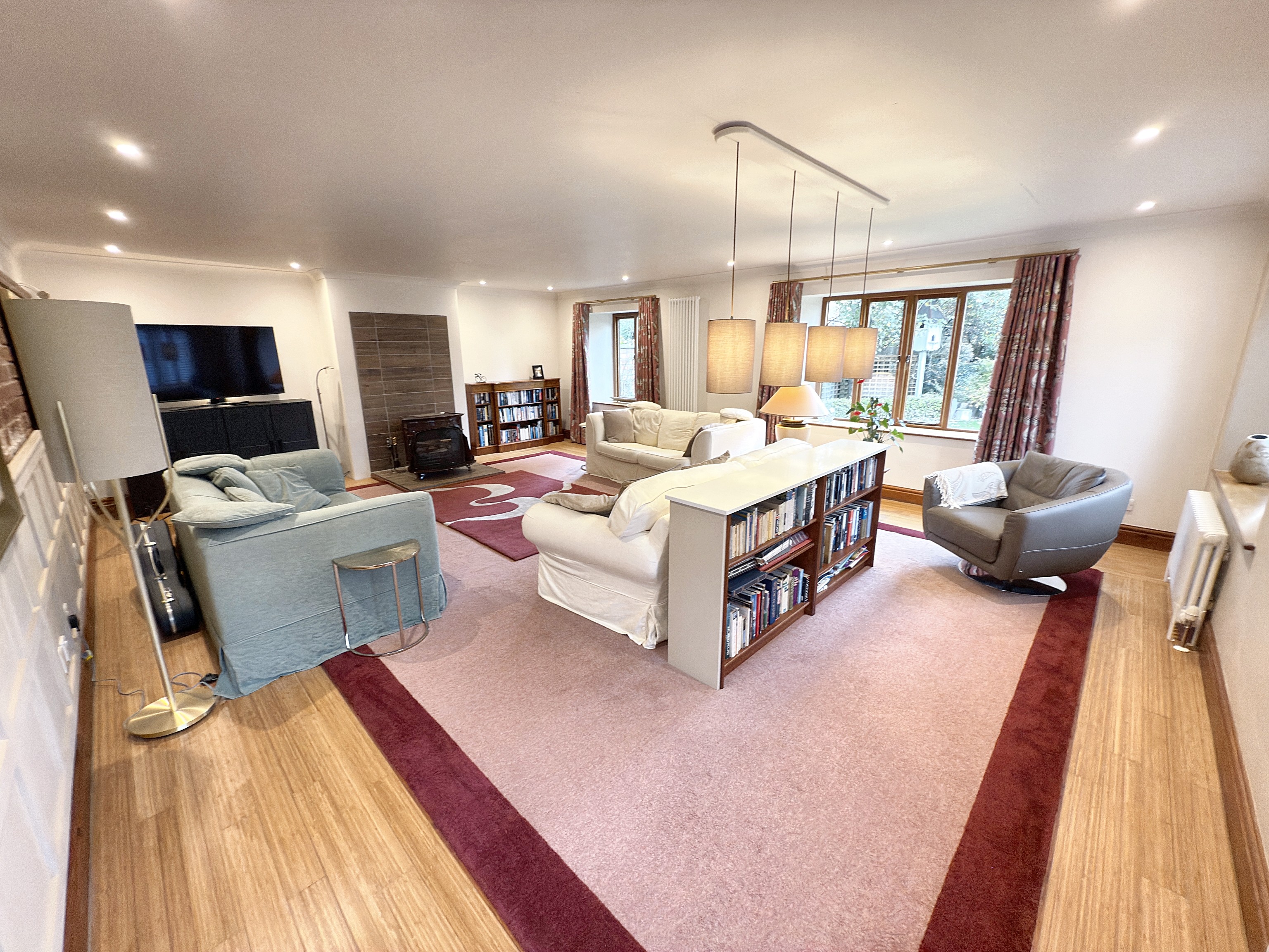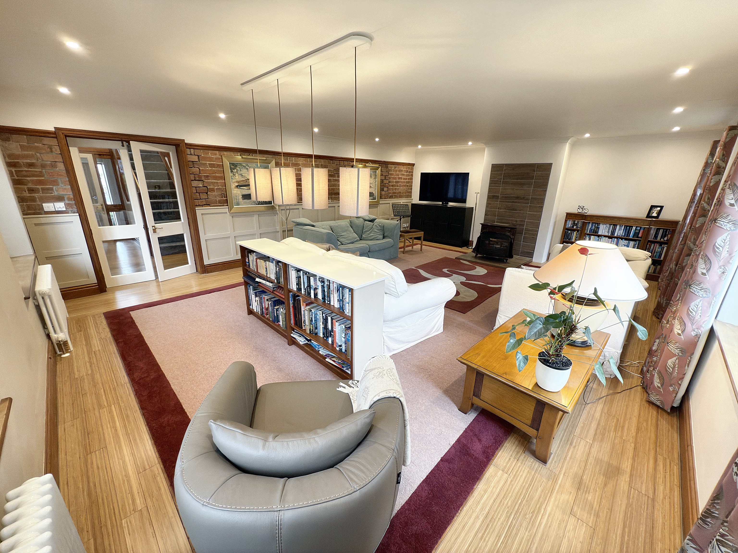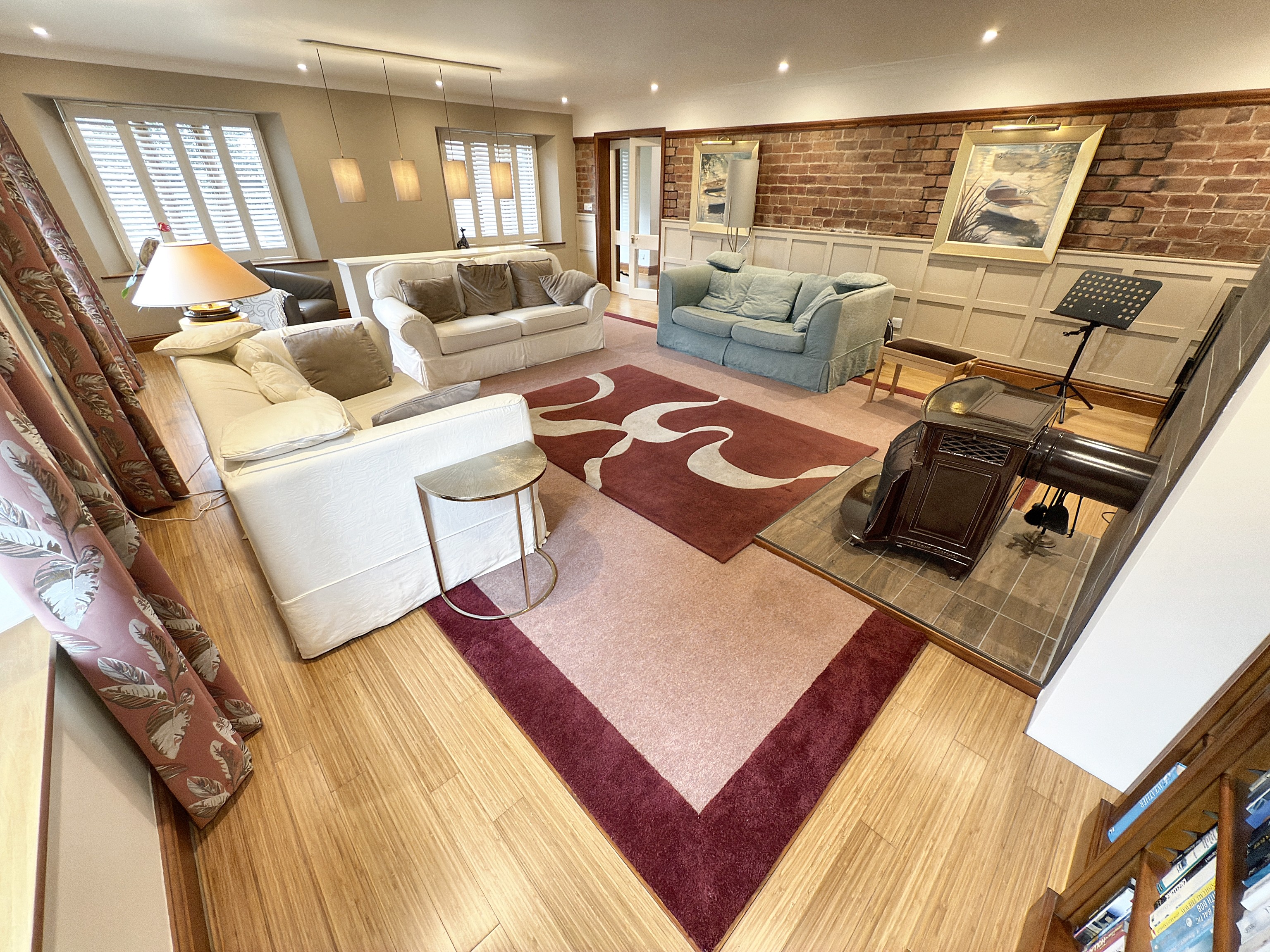 The expansive family lounge is bathed in natural light, creating a warm ambience accentuated by a cosy log-burner - perfect for relaxing evenings.