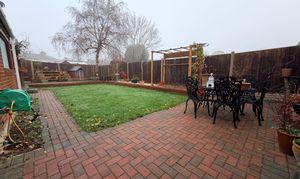 Externally, the rear garden has been thoughtfully arranged for ease of maintenance, with a block-paved patio creating an ideal seating area, leading onto a lawn and enclosed by fencing to provide privacy. The property further benefits from a garage located to the rear.