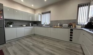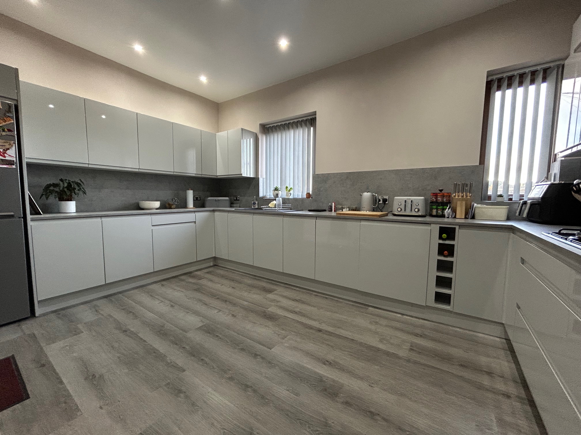 A superb, recently fitted contemporary kitchen, presented with a range of high gloss fronted base and wall units together with complementary counter worktop surfaces and inset sink unit. Integral appliances include an electric oven, gas hob, extractor fan over, dishwasher, washing machine and microwave. Staircase off leading down to a useful basement keep cellar.