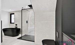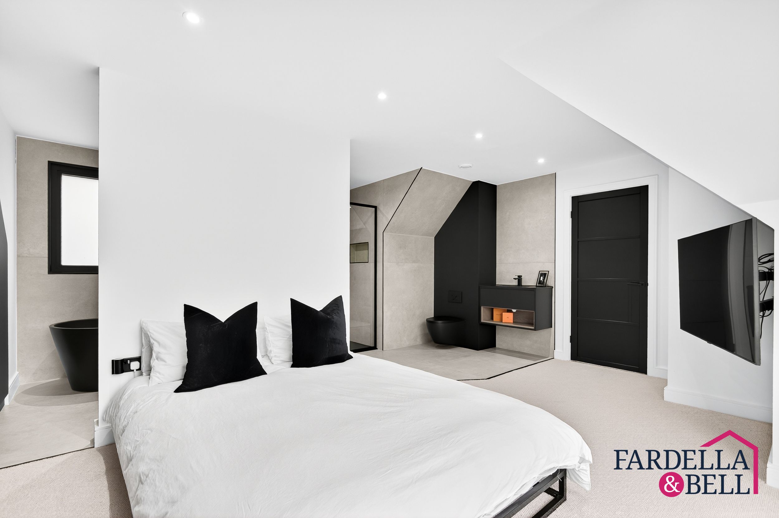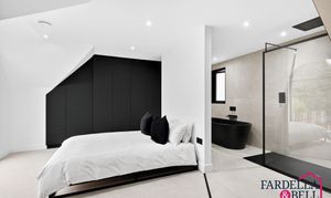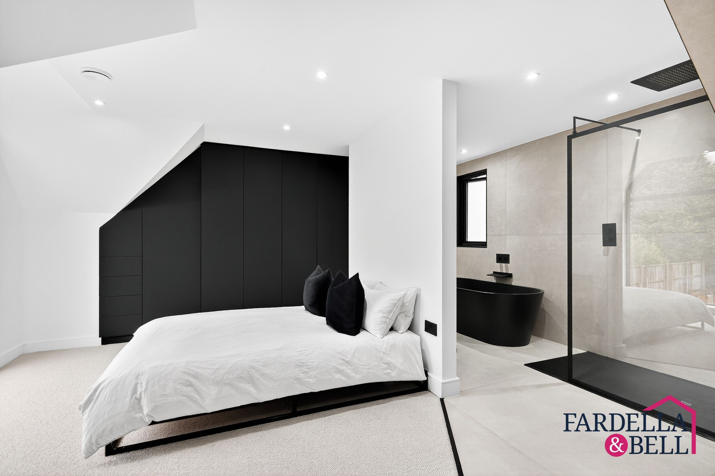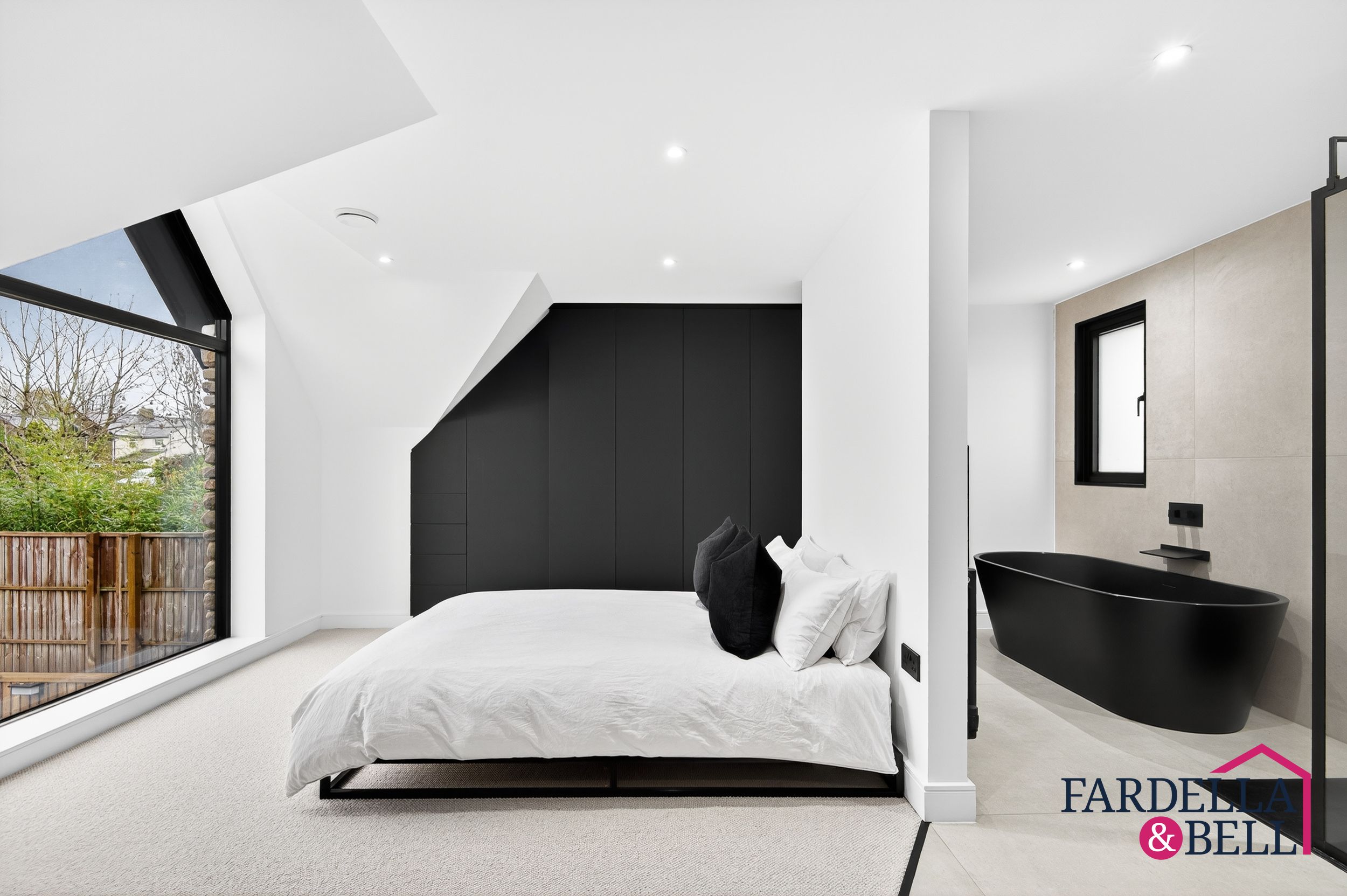 The master suite delivers a sense of calm luxury, defined by generous space and carefully considered details. A dramatic window fills the room with natural light and frames sweeping views of the grounds. Custom wardrobes are built in for a streamlined look, while a crisp monochrome scheme keeps the design simple and refined. The adjoining en‑suite continues the indulgent feel, with a sculptural black freestanding bath, a rainfall shower, and a wall‑mounted vanity. Large tiles and subtle finishes tie everything together, giving the space the atmosphere of a private retreat to escape and unwind.
