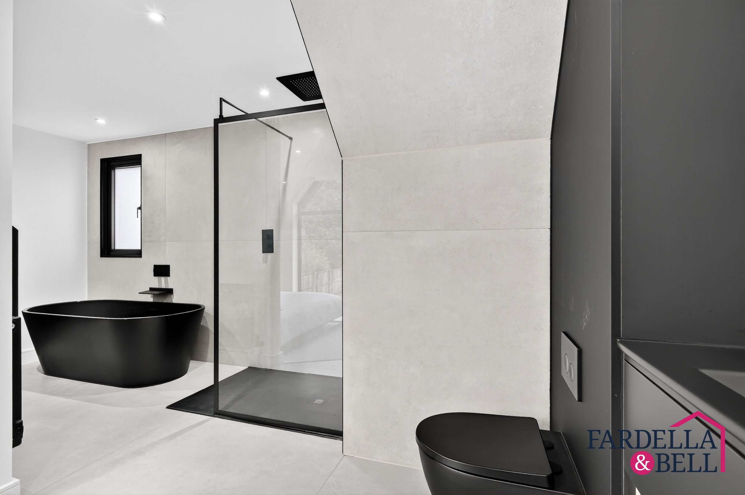 The private en‑suite to bedroom two exudes sophistication, offering a walk‑in shower finished with striking matte black accents that speak of understated elegance. A floating vanity, paired with designer fittings, and a sleek wall‑mounted toilet elevate the space with refined modernity. Filled with natural light across the room, illuminating its polished monochrome palette and creating an atmosphere of effortless luxury.
