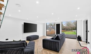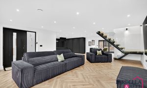 The heart of the home - Herringbone flooring, floating oak & glass staircase, floor to ceiling windows, a space for a large dining table perfect for hosting, TV point, spotlights to the ceiling, radiator and patio doors leading to the rear aspect. This whole area is thoughtfully designed for comfort and ideal for modern family living.