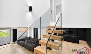 The landing sits at the top of a floating staircase with oak steps, black steel supports, and glass balustrades. Bright and open, it overlooks the living area below like a gallery. Sleek black doors lead to the upstairs rooms, continuing the modern style. This space is a bold design feature that immediately catches the eye.