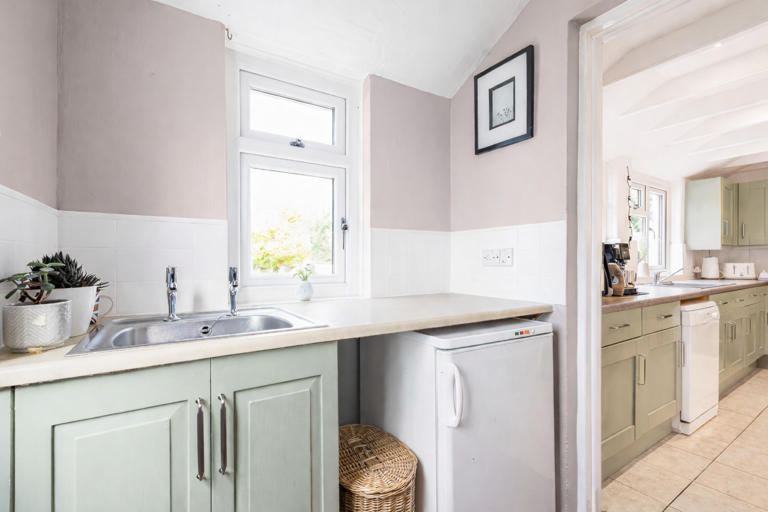 Off the kitchen, a large utility/boot room. A handy space for coats and shoes as well as plumbing for washing machine and sink, door to side garden.