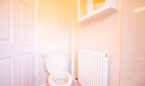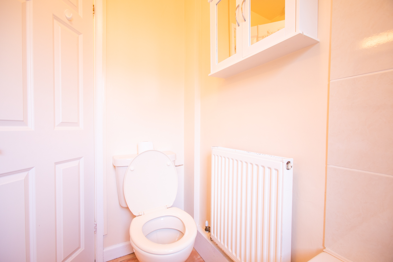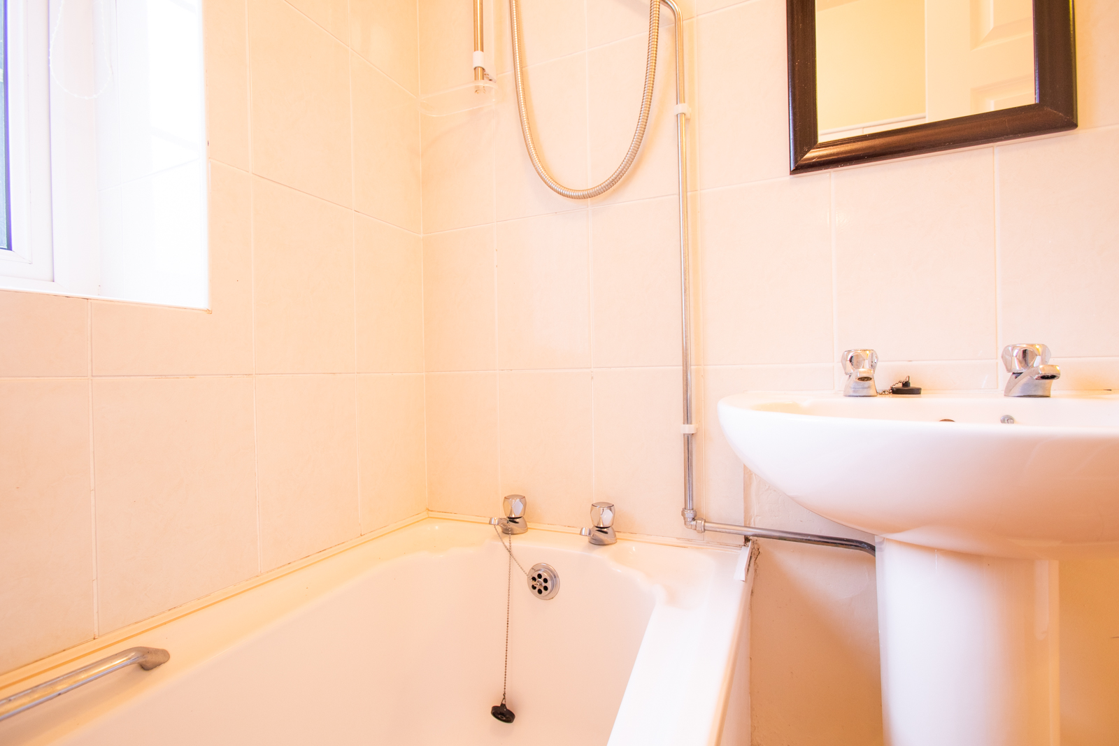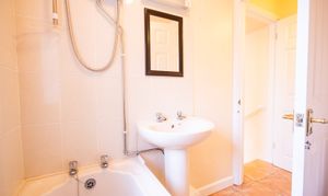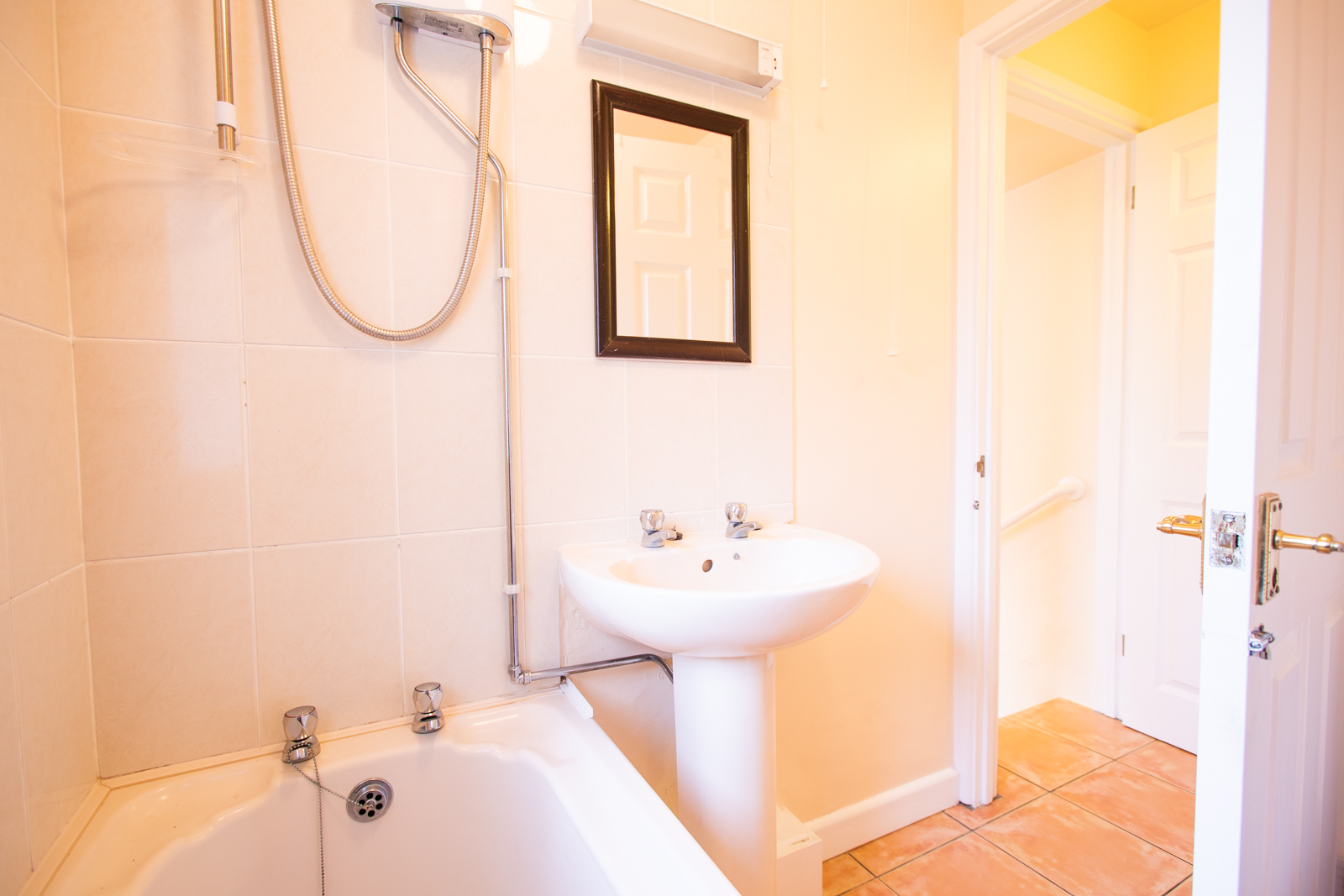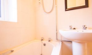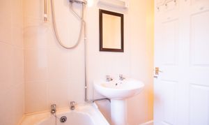 Obscured double glazed window to side aspect, bath with shower over, low level W/ C, wash hand basin, radiator, tiled floor.