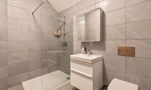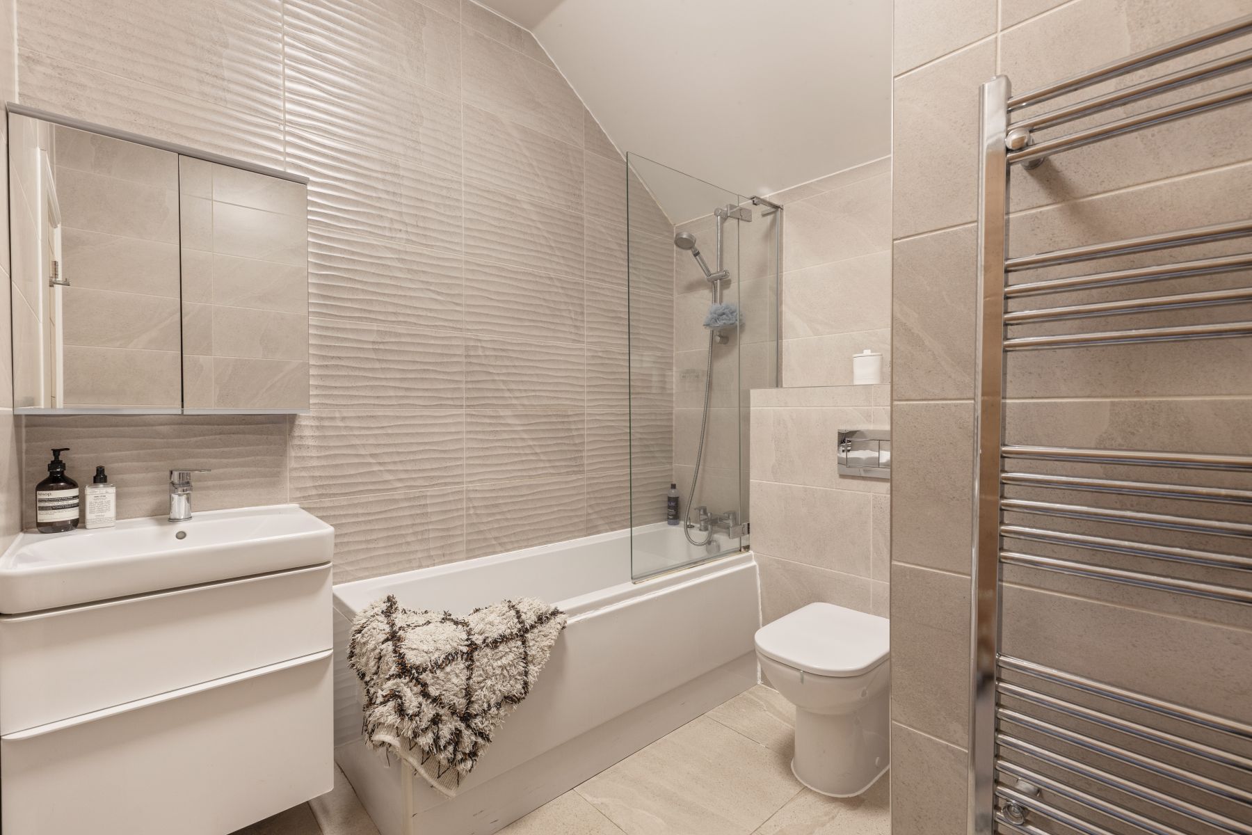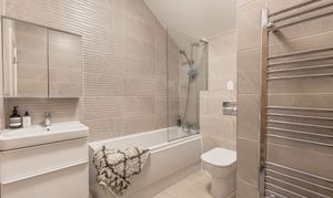 Upstairs, the master bedroom enjoys the same views as the living room and is a lovely double room with a triple door built-in wardrobe and perfect recess for a dressing table. The en-suite features a walk-in shower, WC and wash basin with useful storage beneath with a heated towel rail and tiled walls and flooring. Bedroom 2 is another double room, with a double door built-in wardrobe and space for additional furniture. The family bathroom features a bath with a shower over, WC, wash basin with storage beneath and a heated towel rail with tiled walls and flooring. The accommodation is beautifully presented throughout, with neutral tiling in the bathrooms and tasteful decor throughout with white walls to the living space and soft pastel tones to the bedrooms for a really homely feel.
