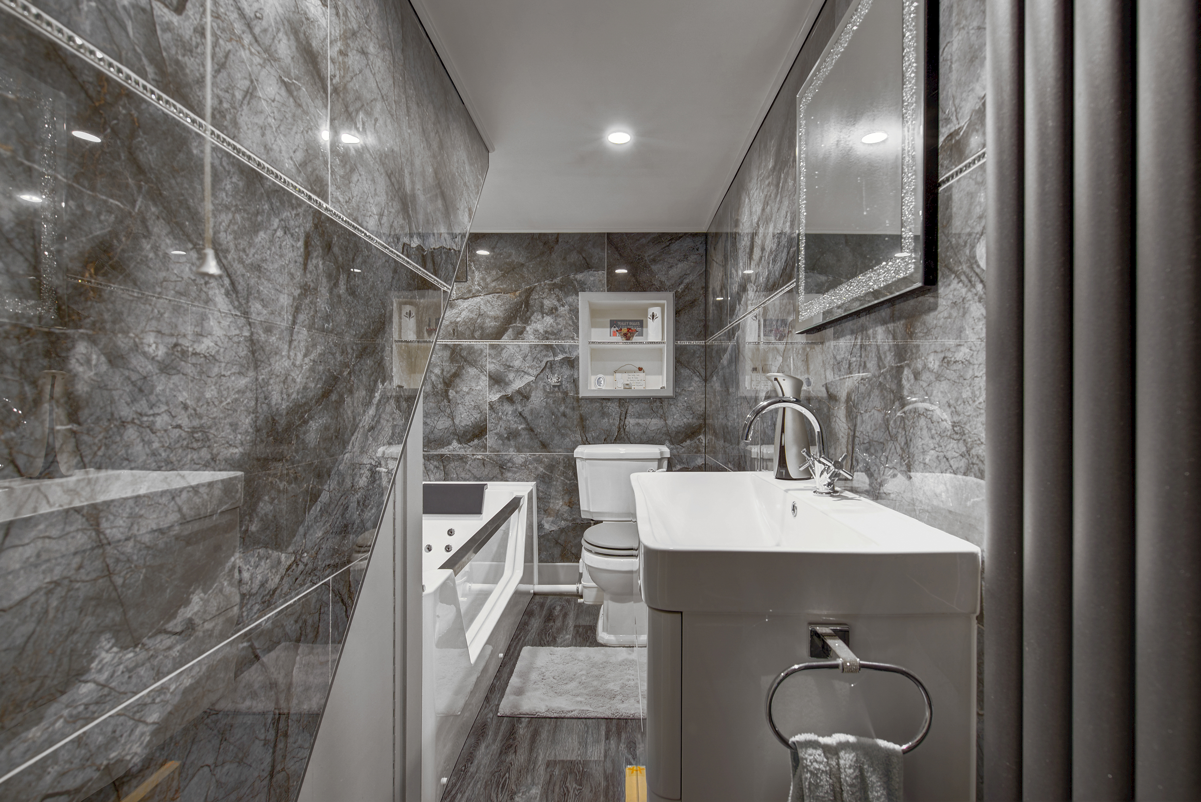 Jacuzzi bath, vanity sink unit, low flush wc, tiled walls and modern anthracite radiator.