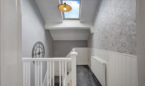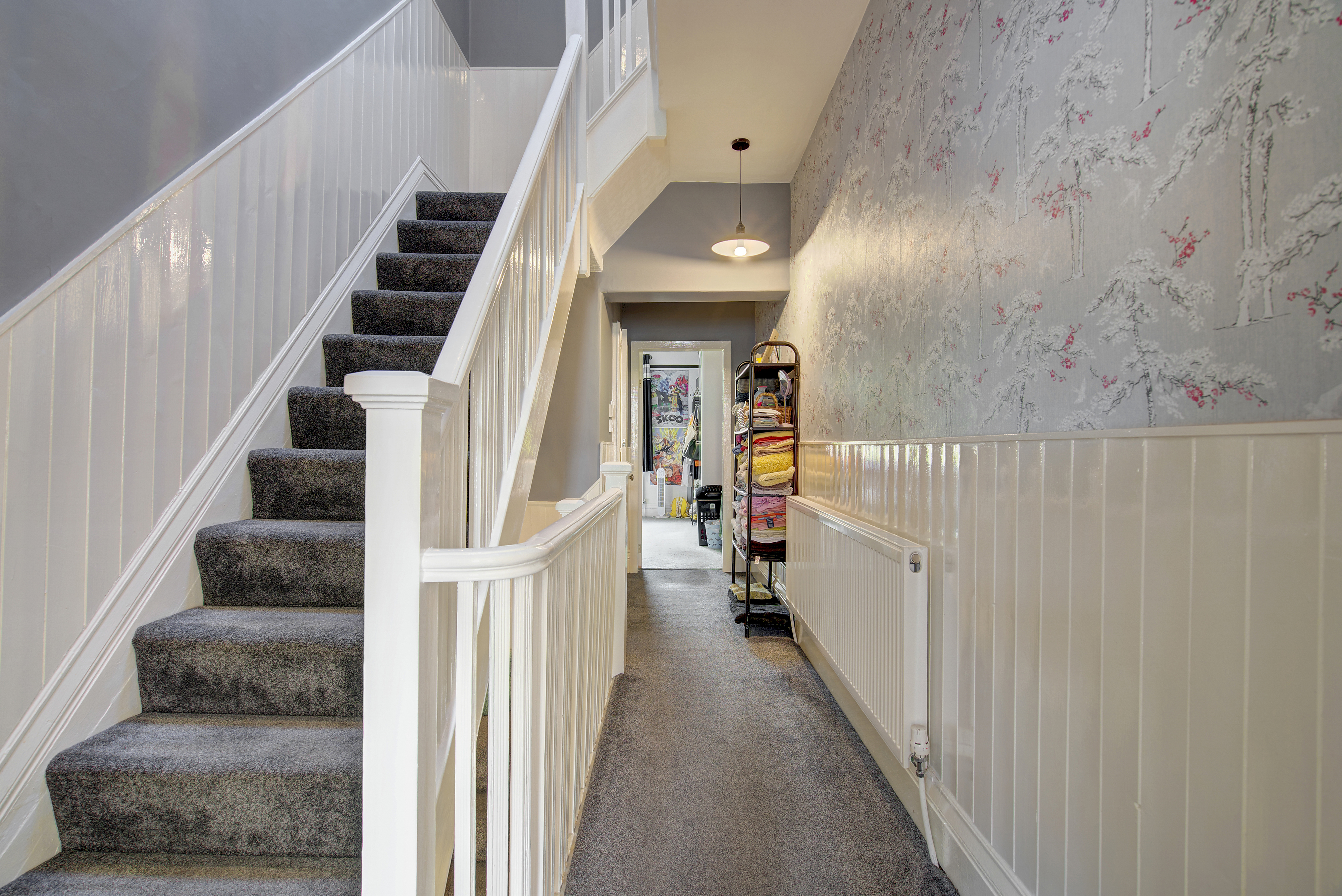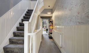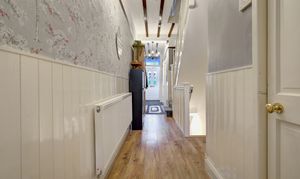 Vestibule entrance, through to hallway with laminate flooring, picture rails, radiator and wood panelling.