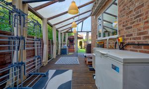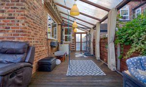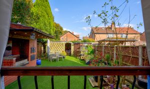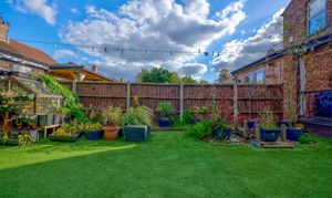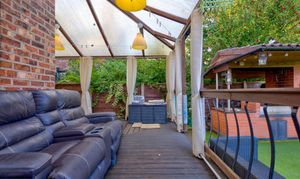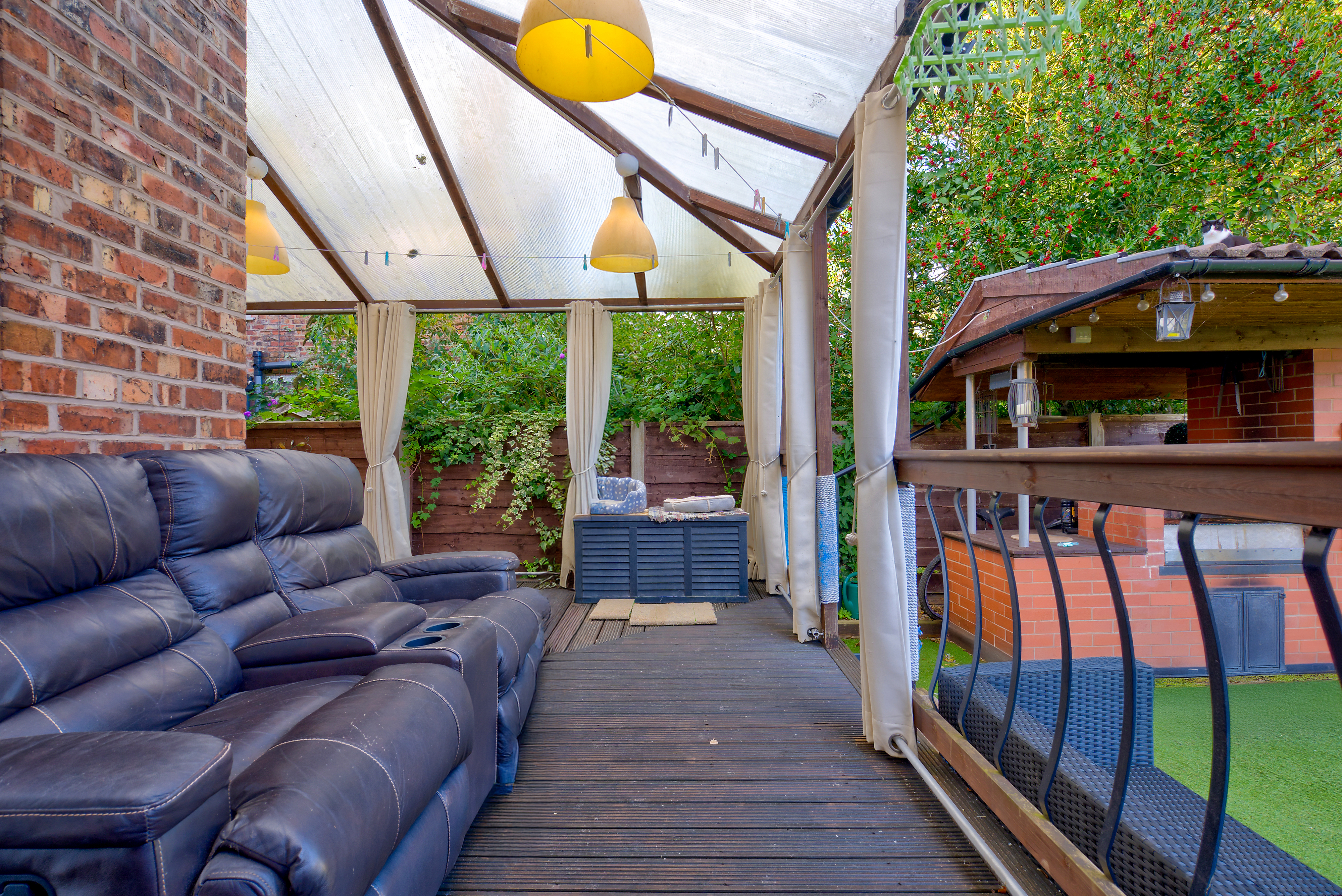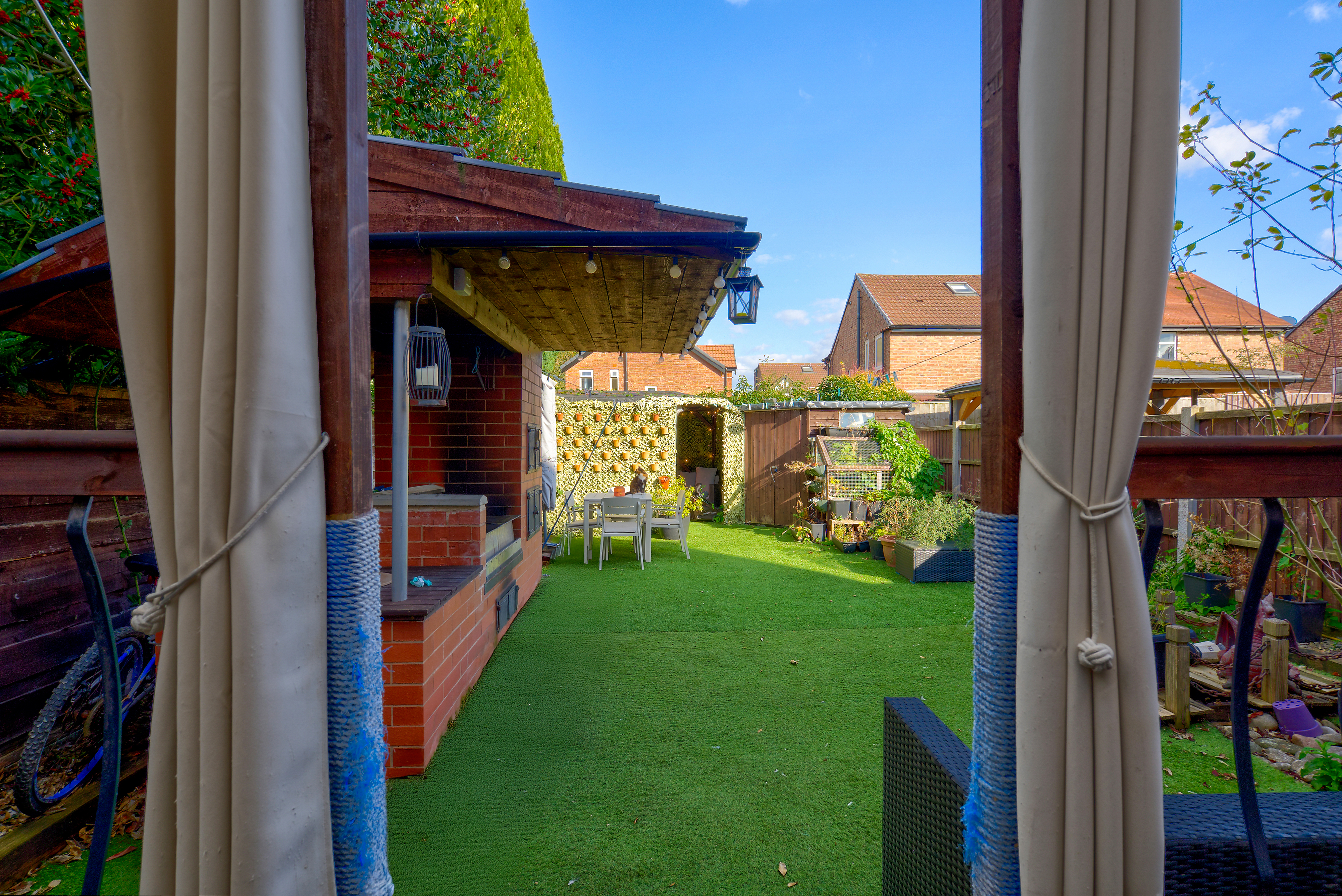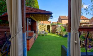 The garden really comes into its own with the impressive indoor–outdoor seating area, a wraparound canopy with wooden decking and closable drapes that lets you enjoy the space in comfort whatever the weather. On bright summer days, it opens up as a breezy social hub, while on cooler evenings the curtains can be drawn to create a cosy, private retreat. Whether it’s morning coffee, family gatherings or late-night drinks with friends, this versatile space ensures the garden can be enjoyed all year round. a brick-built outdoor kitchen featuring a barbecue, tandoor clay oven and smoker, creating a true foodie’s paradise, while the covered hot tub area invites you to unwind whatever the weather. Finished with low-maintenance artificial lawn and space for family and friends, this is an outdoor retreat that feels as stylish as it is practical.