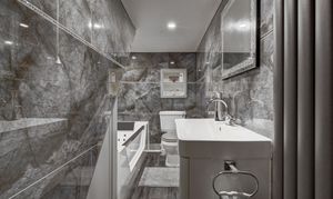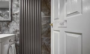 Side facing upvc window, walk in cubicle shower, low flush wc, wash basin, tiled flooring with under floor heating and a heated towel rail.