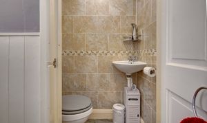Low flush WC, hand wash basin, tiled flooring and walls.
