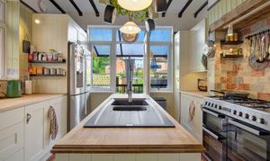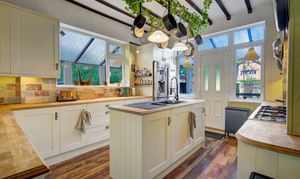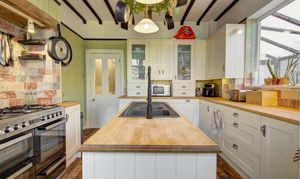 - Contemporary kitchen with centre island, cream units, wooden worktops and direct garden access