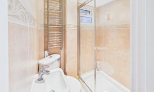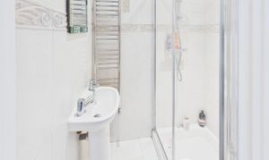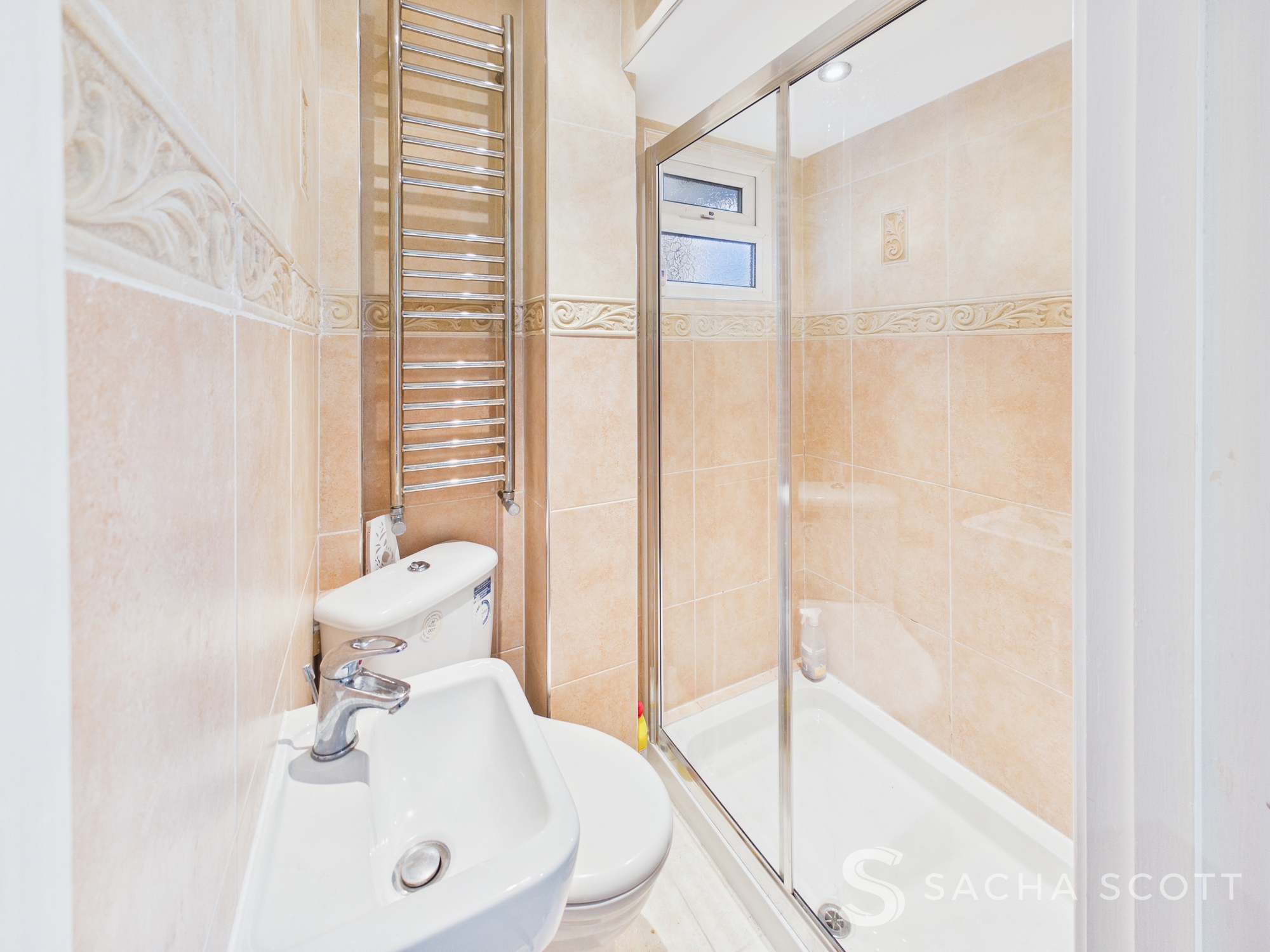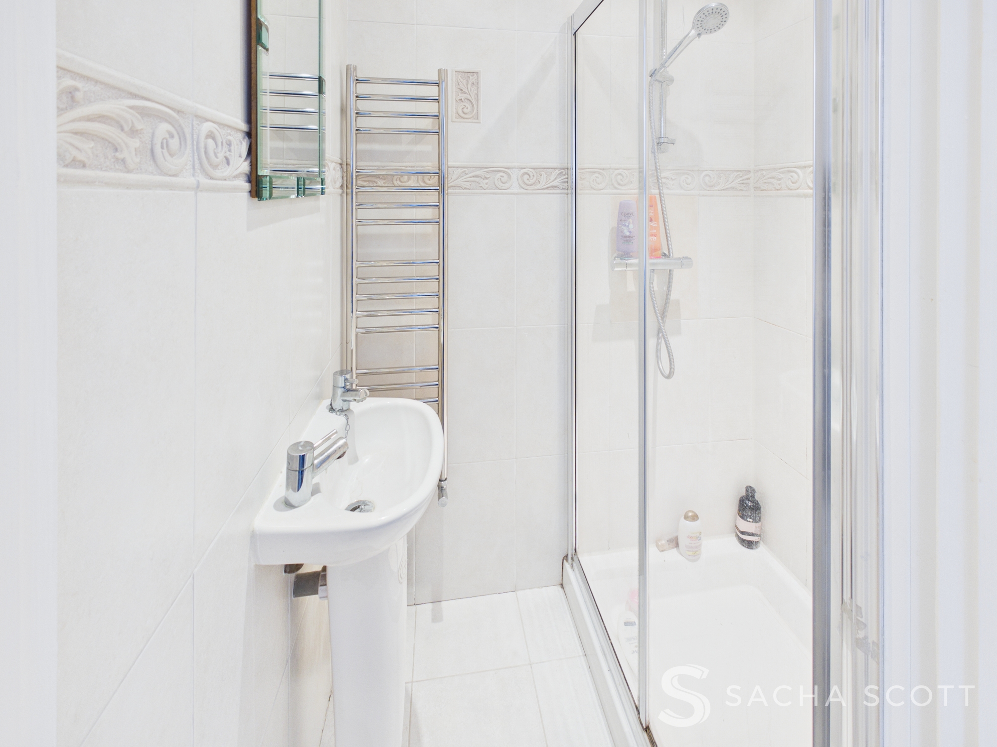 Fully tiled and offering a large shower enclosure, heated towel rail and sink.