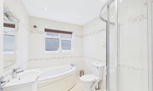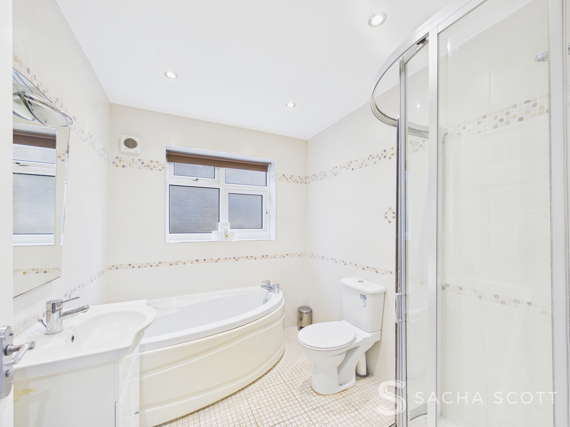 Fully tiled, the family bathroom offers a bath, WC, sink and separate shower enclosure.