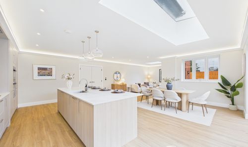 Centrally located between the modern kitchen and main lounge area, the generous dining space receives triple aspect light from front, side and rear and offers neutral decor and warm, parquet flooring.