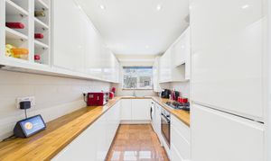 Recently fitted, the kitchen offers ample work surface and storage space, integrated appliances and views over the quiet cul-de-sac.