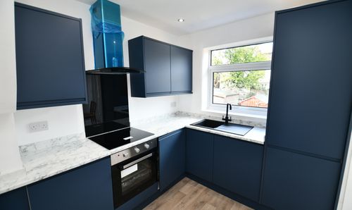 Featuring a modern range of fitted units with integral hob and oven. Complete with ceiling light point, two double glazed windows and a wall-mounted radiator
