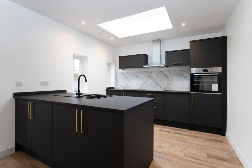 The home features a stylish open-plan kitchen, dining, and living area with a striking vaulted ceiling, skylight, and floor-to-ceiling windows that flood the space with natural light. The well-appointed contemporary fitted kitchen includes integrated appliances and a breakfast bar, perfect for modern living.