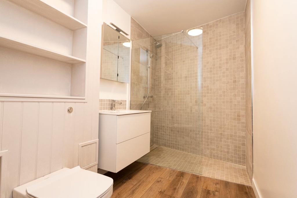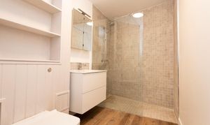 The bedroom offers built-in wardrobes, while the generous bathroom is fitted with an oversized walk-in shower, a wash basin, integrated storage, and an airing cupboard.