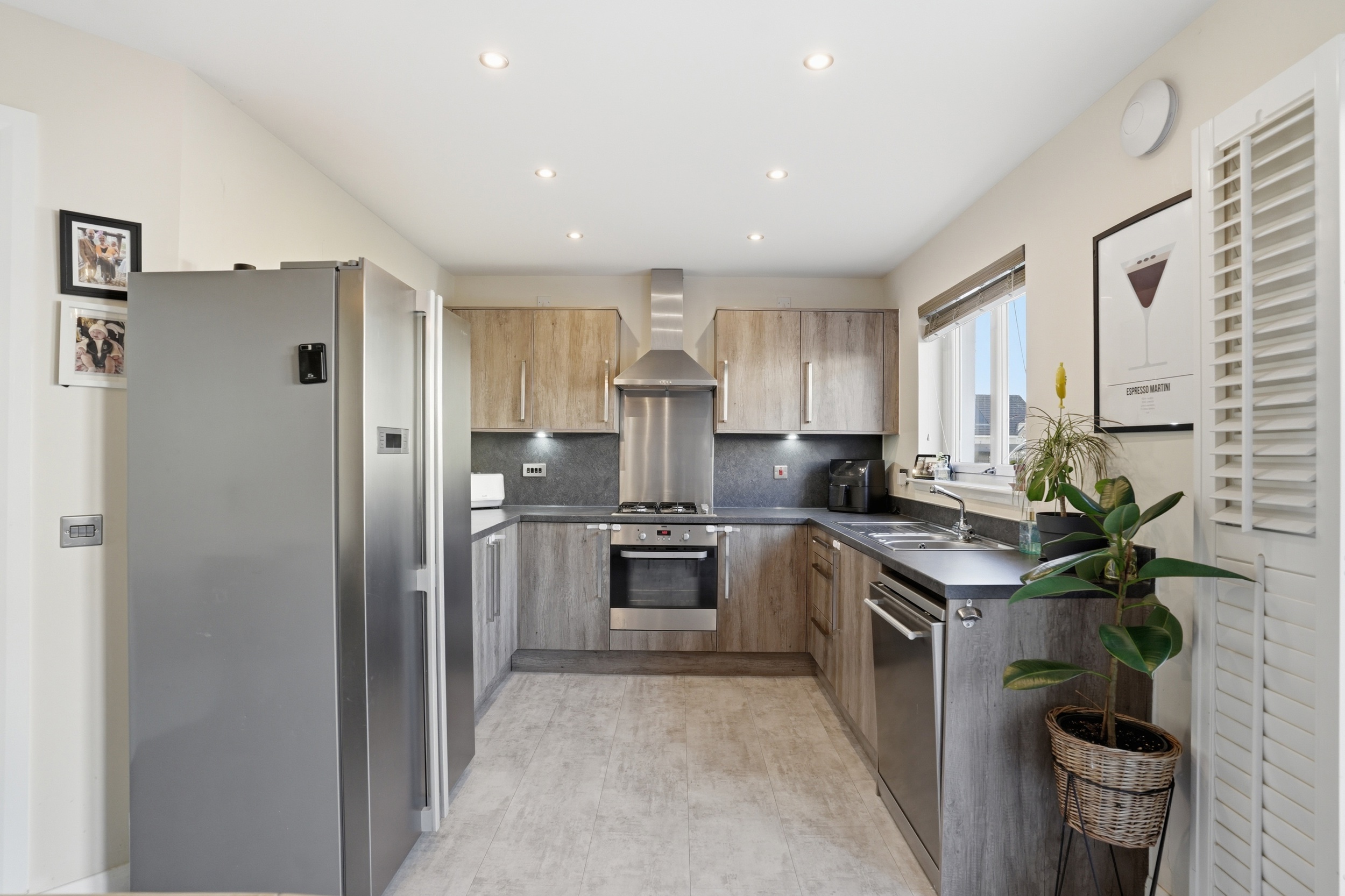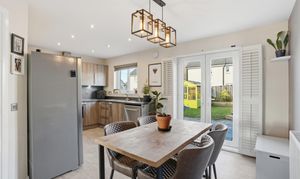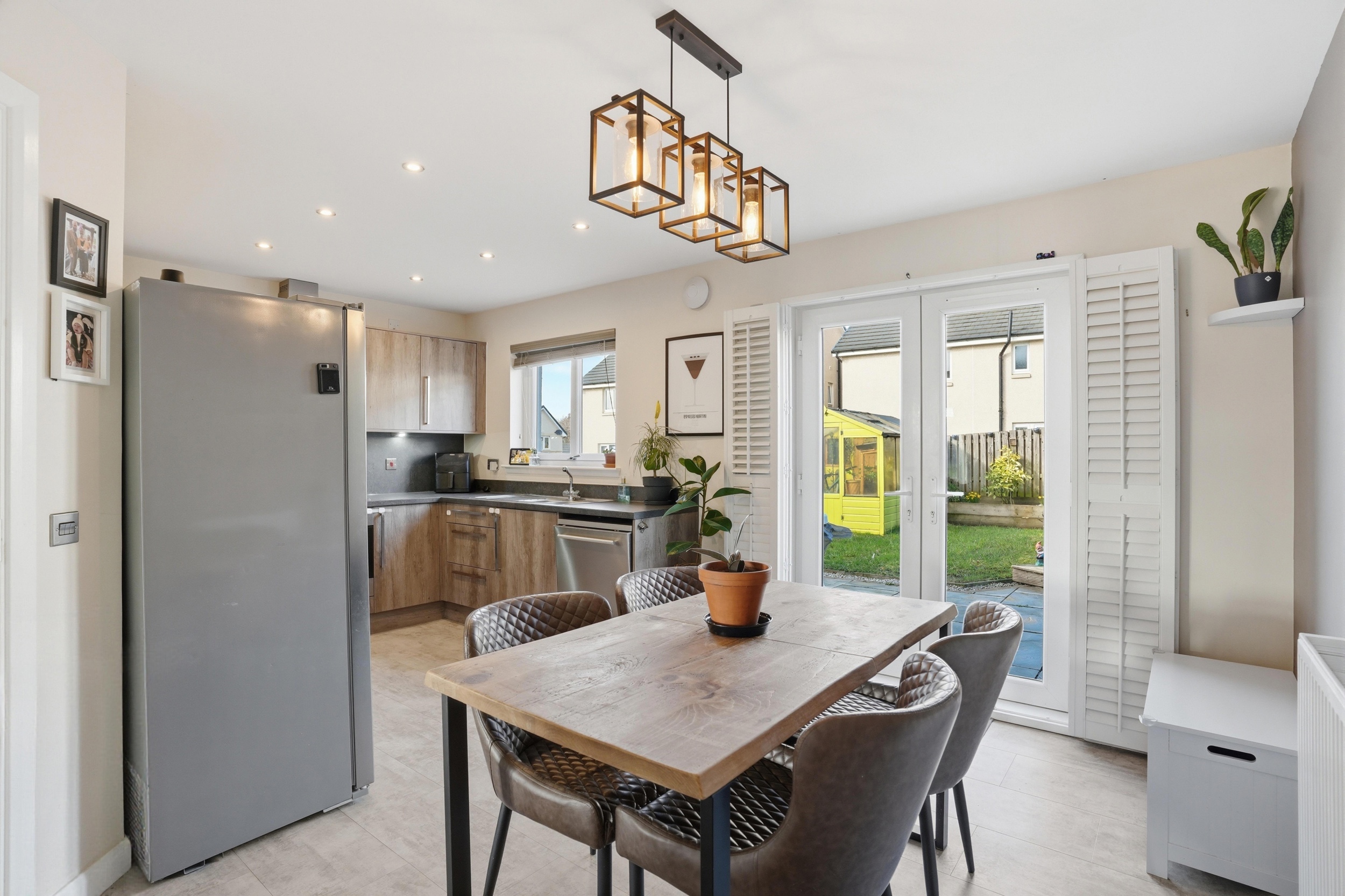 To the rear of the property lies the open plan kitchen and dining area, forming the heart of the home. The kitchen is fitted with ample cabinetry, generous worktop space, a four point gas hob with oven, integrated dishwasher and space for an American style fridge freezer. The dining area comfortably accommodates four to six people, making it ideal for family meals or entertaining guests. Patio doors open directly onto the rear garden, enhancing the indoor outdoor flow.