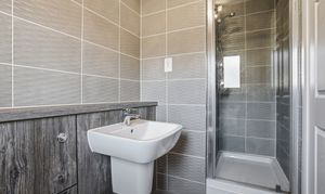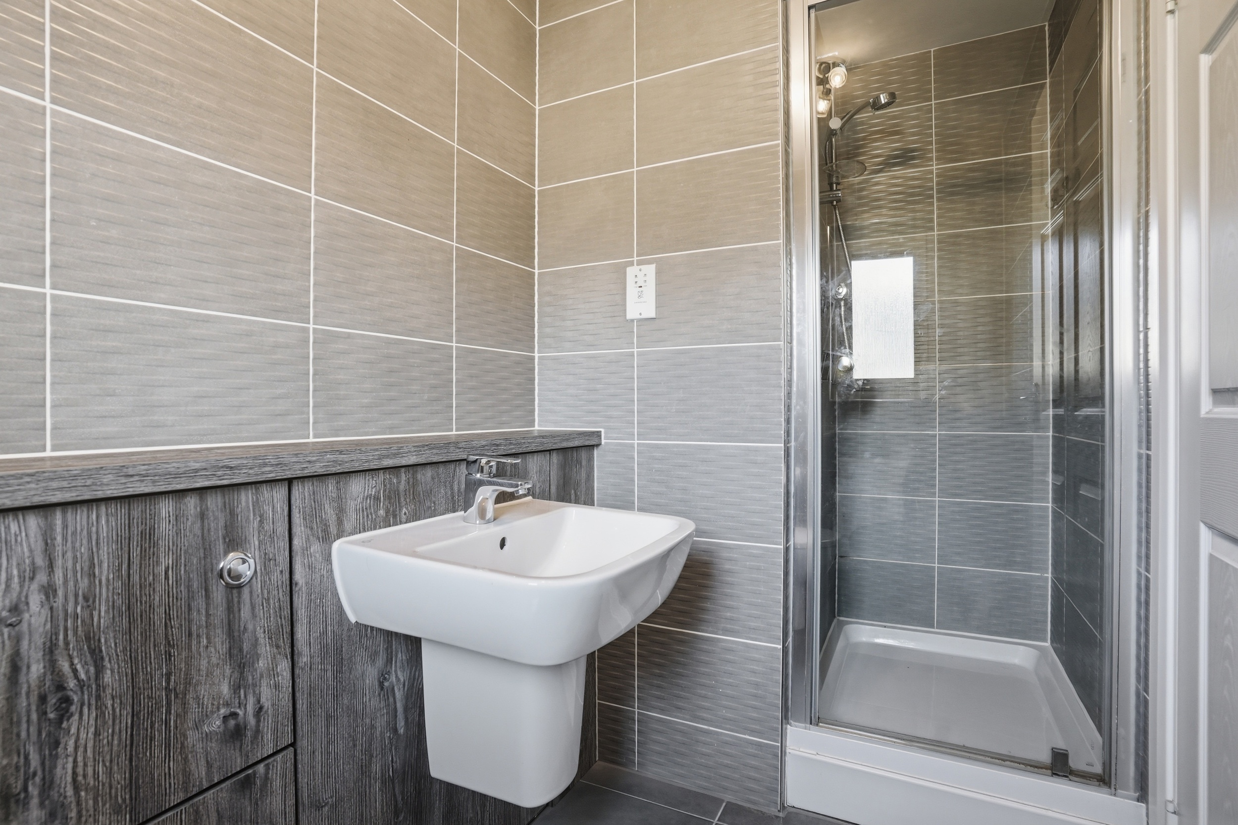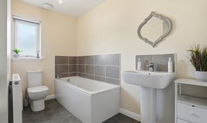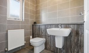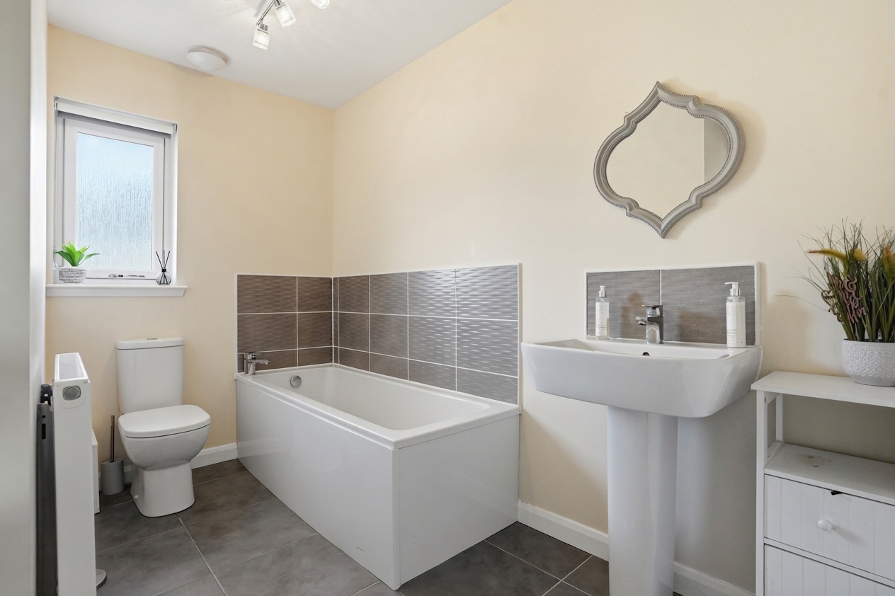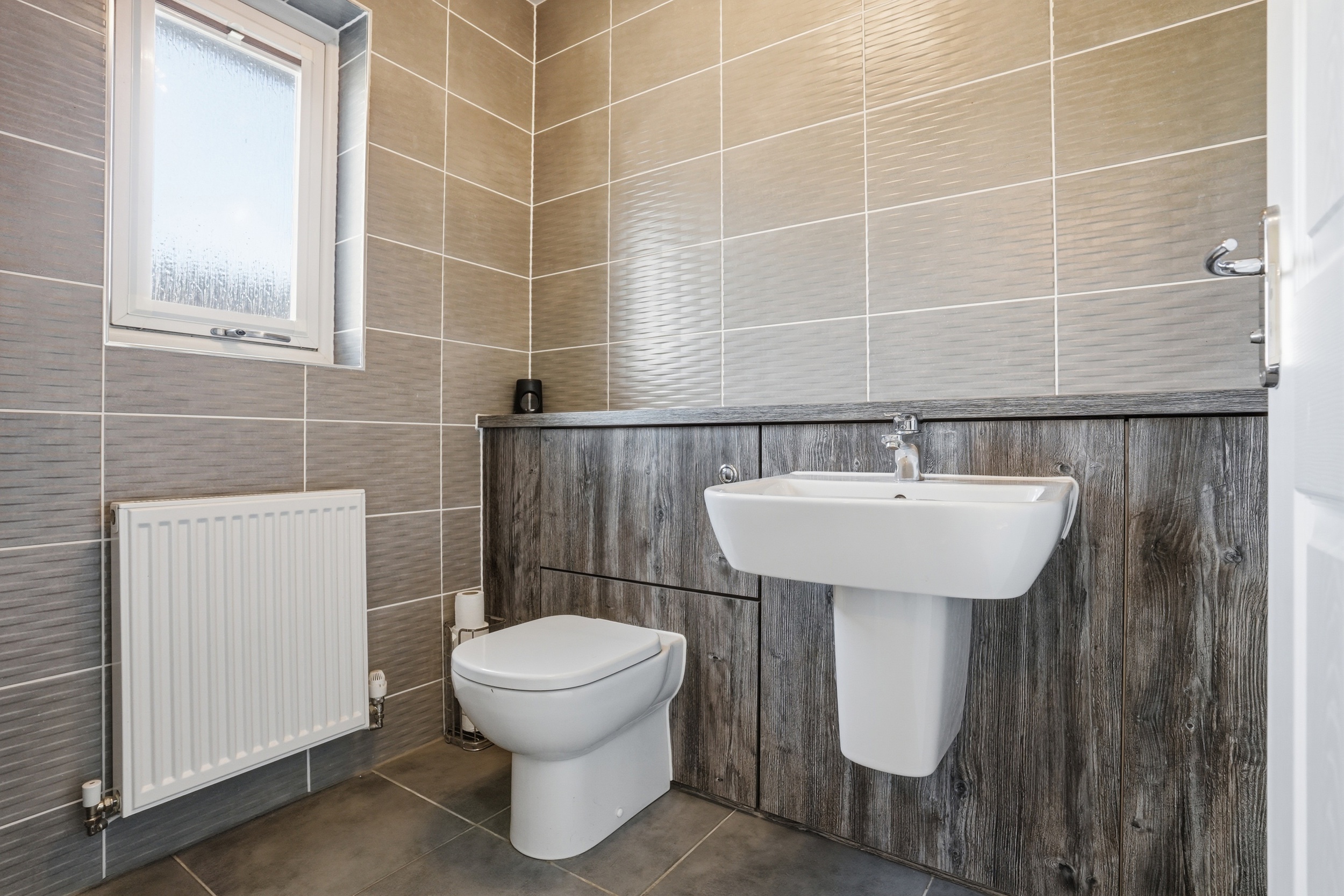 The family bathroom is also located on the upper level and features a three piece suite including a bathtub with overhead shower, finished in a clean and contemporary style.