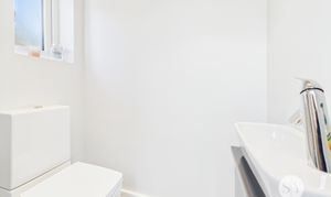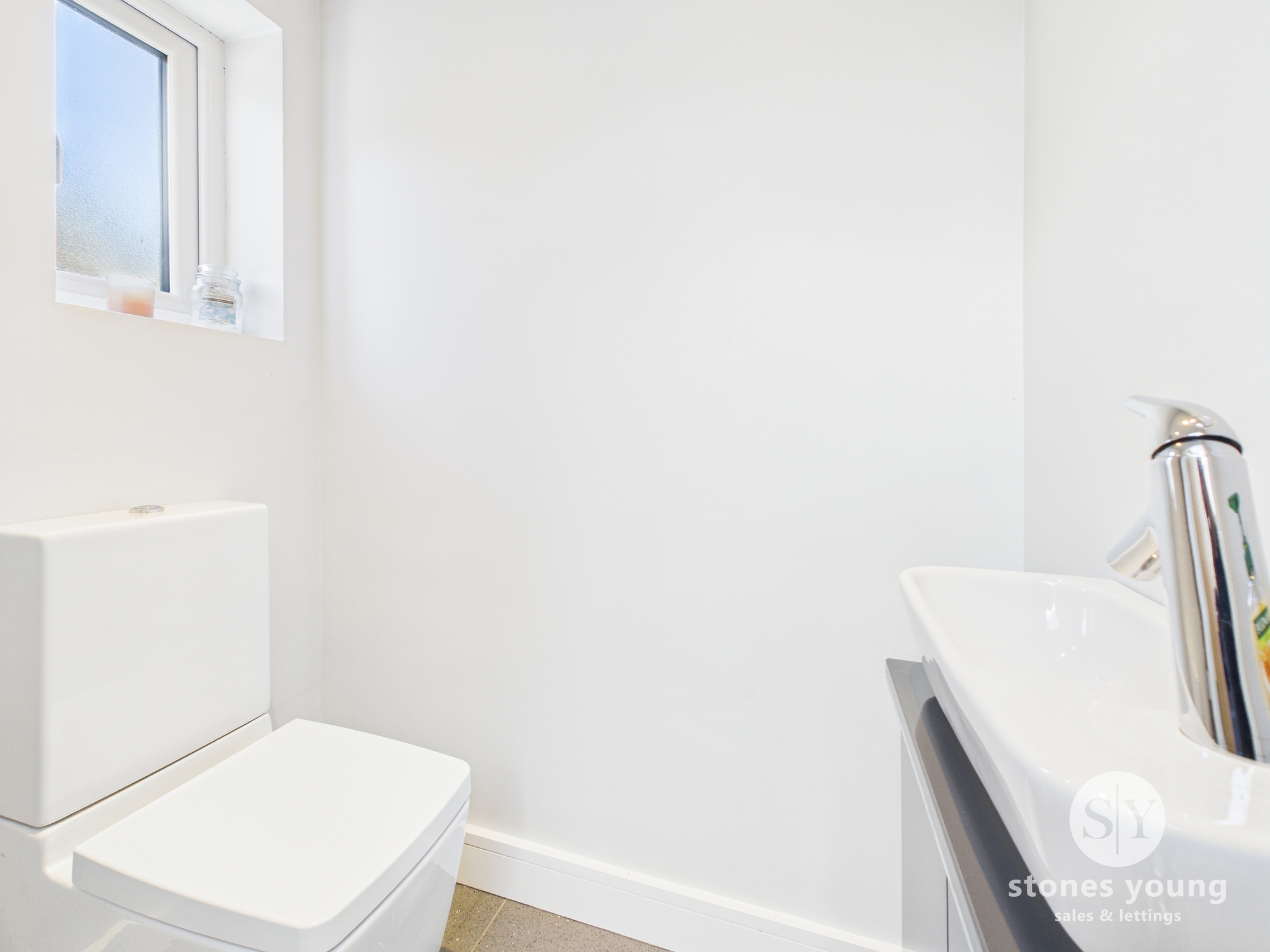 Tiled flooring, wc and basin in white with vanity unit, frosted double glazed uPVC window, column radiator.