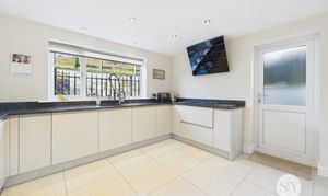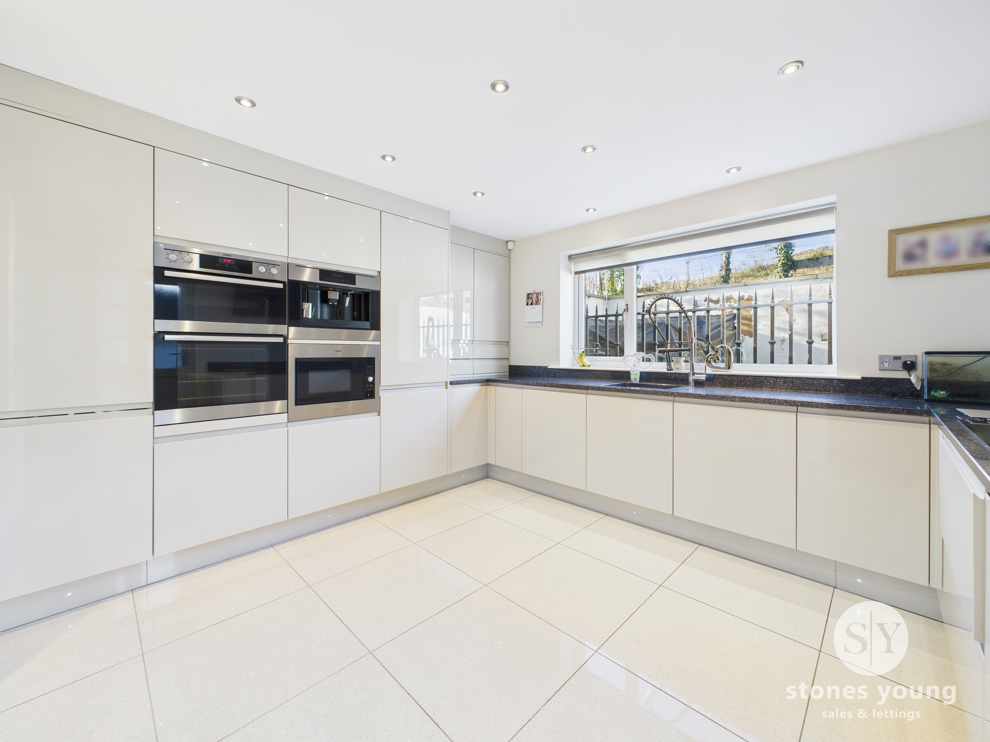 Tiled flooring with underfloor heating, fitted wall and base units with style stone work surfaces, integrated fridge, freezer, dishwasher, washer dryer, oven, grill, microwave, coffee machine, sink and drainer, ceiling spot lights, double glazed uPVC window and door.