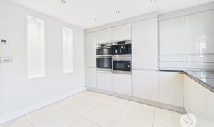 The spacious lounge highlighted by a chic modern fireplace set against a striking surround, complemented by plush neutral carpeting and stylish recessed lighting. The atmosphere is both warm and contemporary, perfect for relaxing evenings or entertaining guests in style. The kitchen is appointed with high-gloss cabinetry, seamless integrated appliances, glossy tiled flooring with underfloor heating, and ample recessed lighting. Large windows flood the space with natural light, amplifying the sense of openness and elegance.
