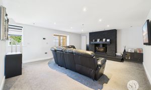 Carpet flooring, ceiling spot lights, wood burner, under stairs storage, stairs leading up to the first floor, x2 double glazed uPVC windows, column radiator.
