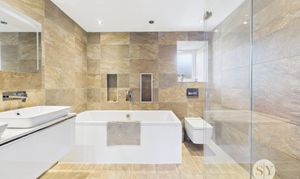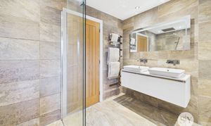 Tiled flooring with under floor heating, five piece in white comprising of double wash basins, walk in shower enclosure, bath tub and wc, tiled floor to ceiling, ceiling spot lights, frosted double glazed uPVC window, towel radiator.