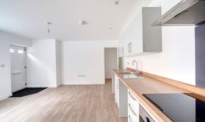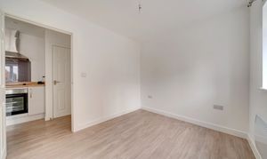 Upon entry, you walk straight into a living area with laminate-effect flooring, which runs throughout the property. In the far left corner of the room is a built-in storage cupboard. The open-plan kitchen is fitted with a range of wall and base units, an electric oven, induction hob, and space for a washing machine and undercounter fridge freezer. A second cupboard off the kitchen houses the water tank and adds some extra storage.