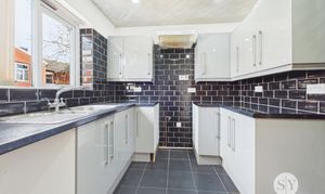Tiled flooring, fitted wall and base units with contrasting work surfaces, tiled splash backs, stainless steel sink and drainer, space for cooker, washing machine and fridge freezer, ceiling spot lights, double glazed uPVC window.