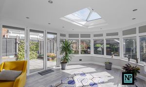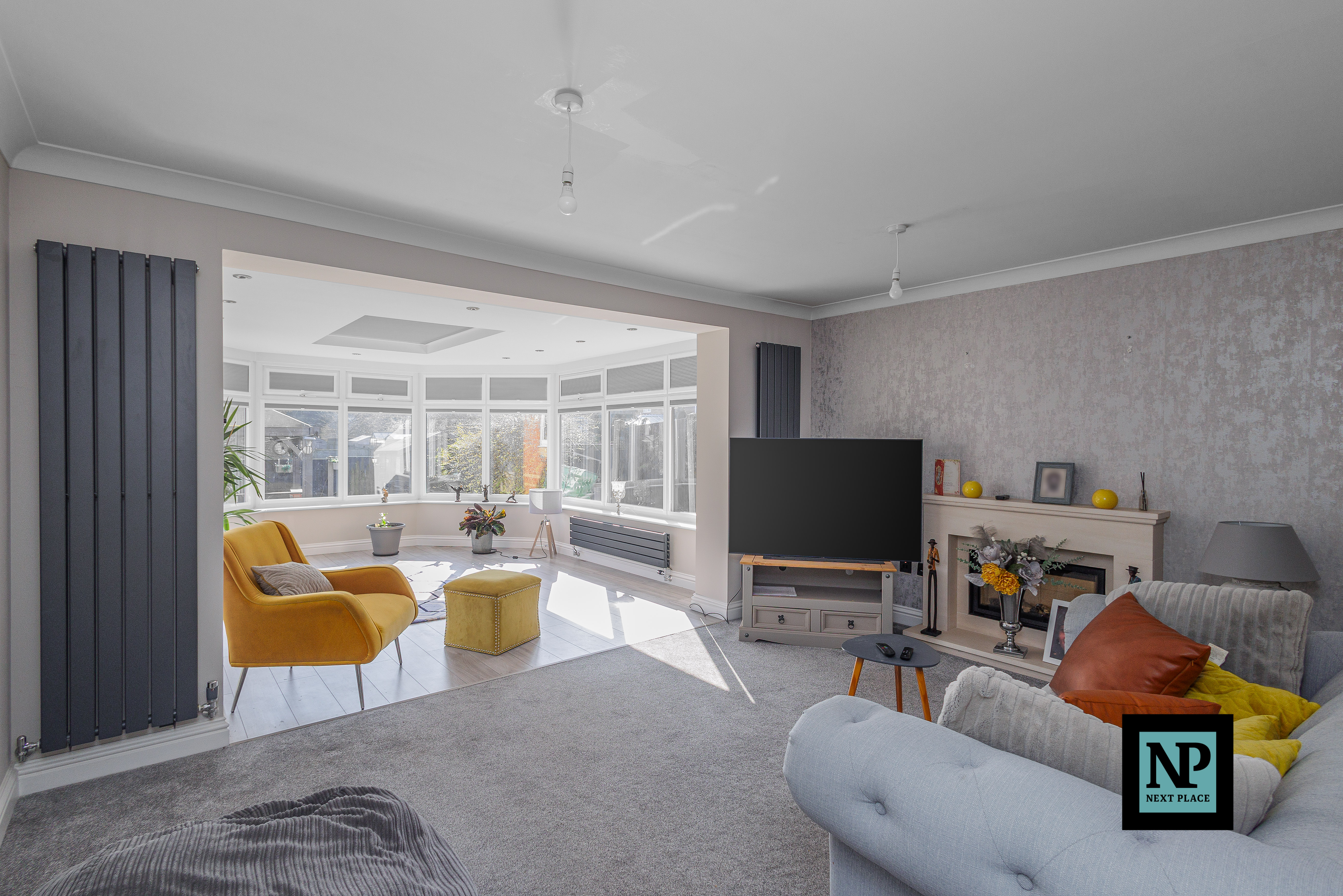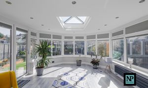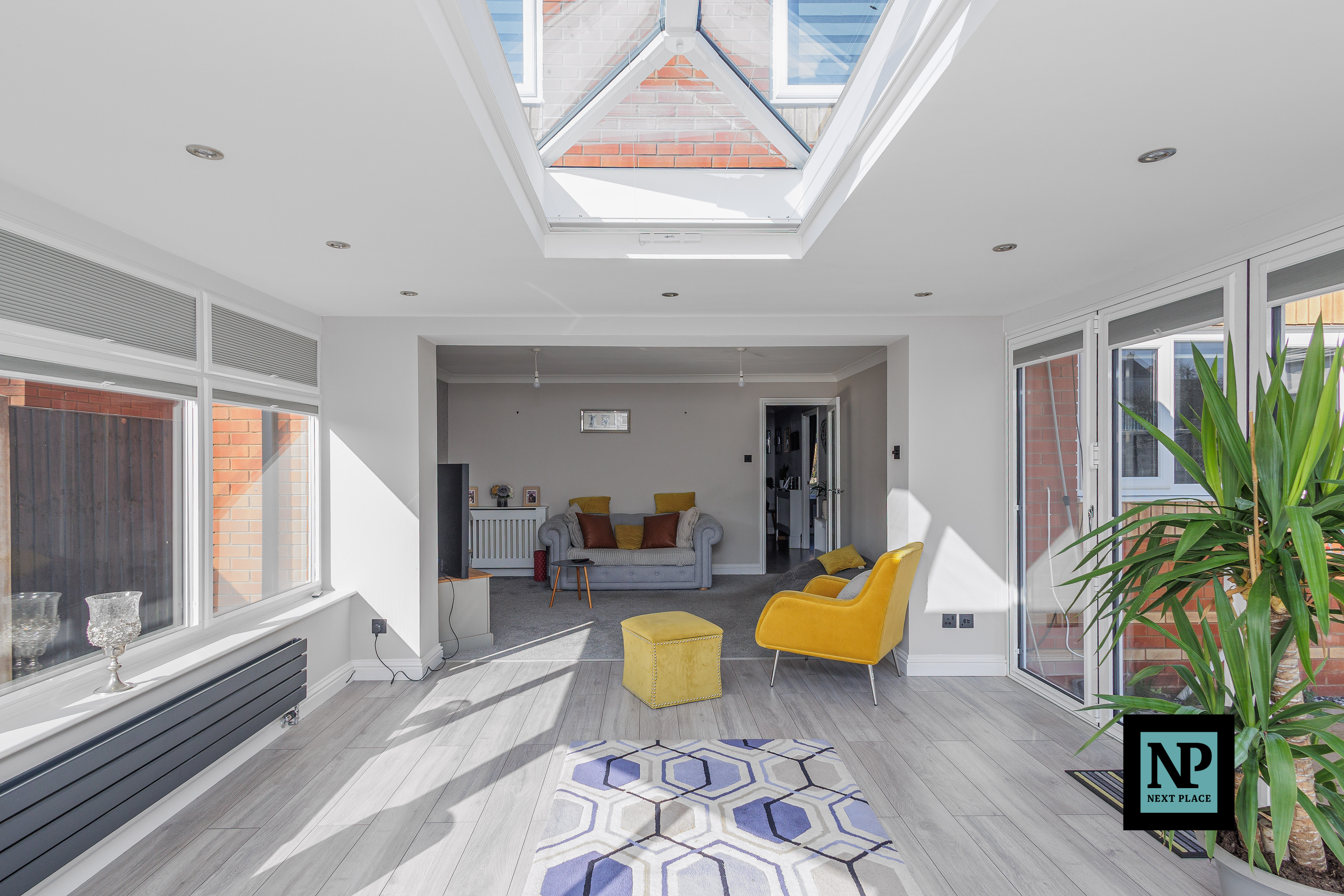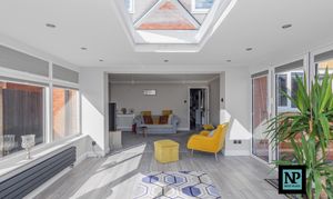 The open plan living room area is a true highlight, with an immidiate cosy lounge area which seamlessley opens out to a fully glazed reception space with striking lantern roof that floods the space with natural light, creating an inviting atmosphere perfect for relaxation or social gatherings with a stunning rear garden backdrop.