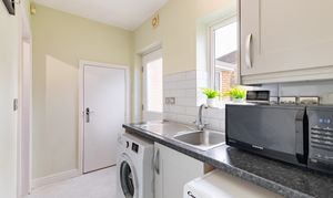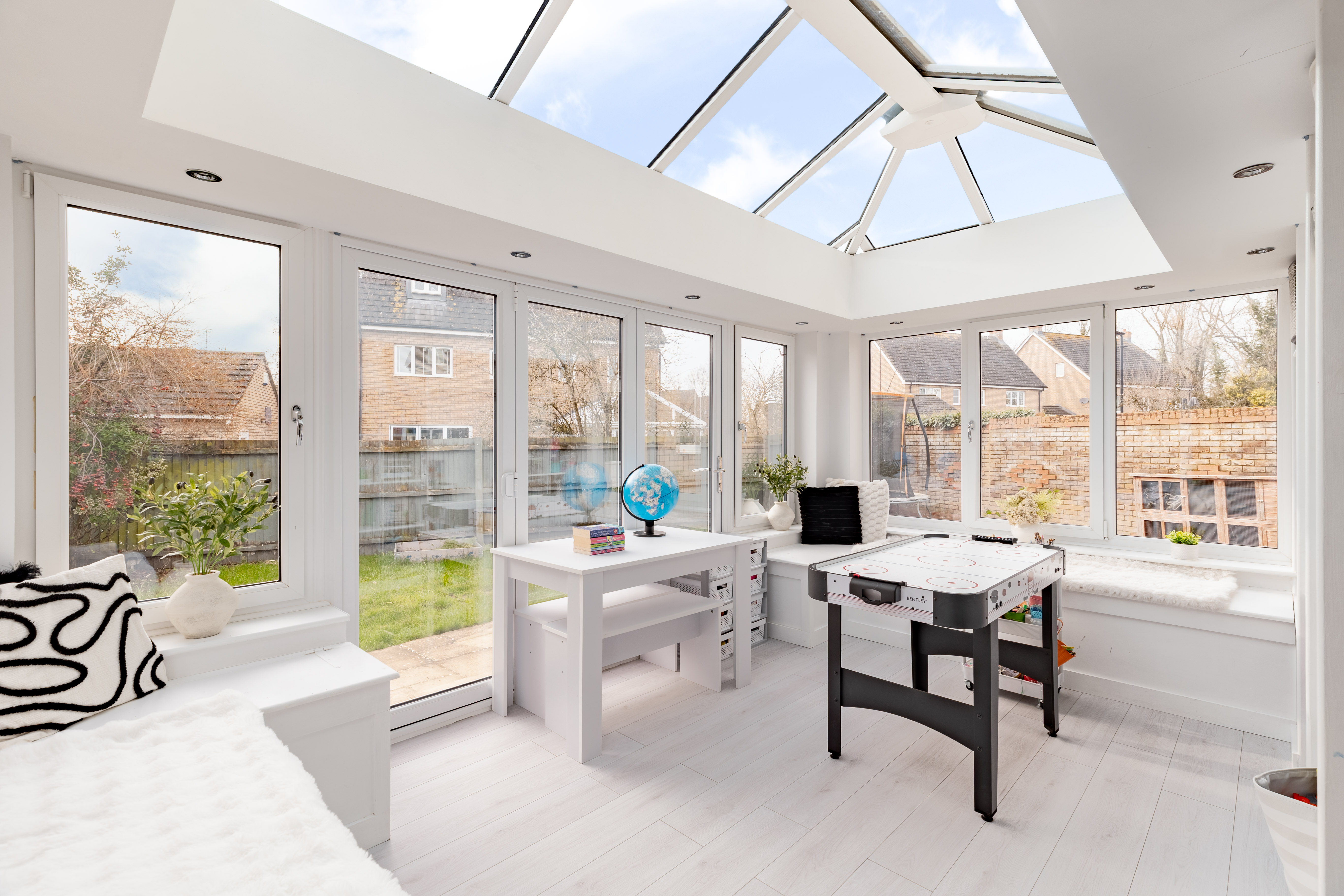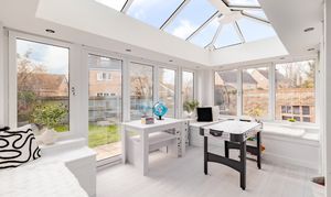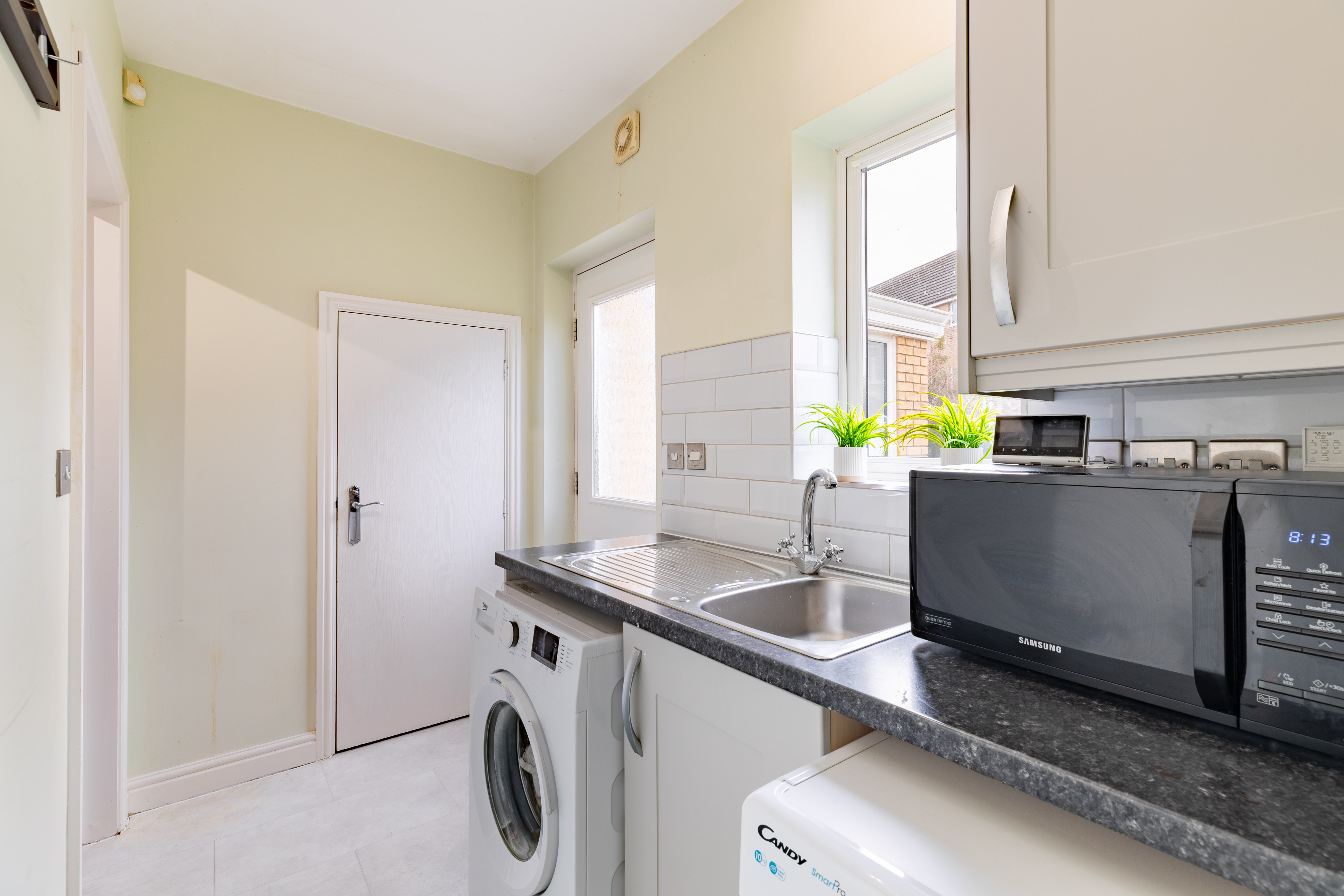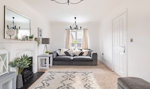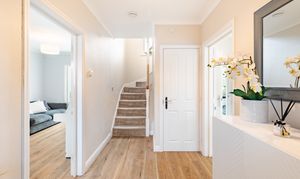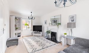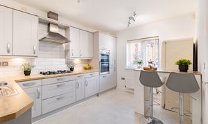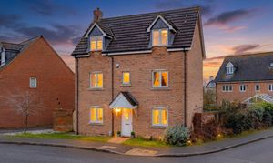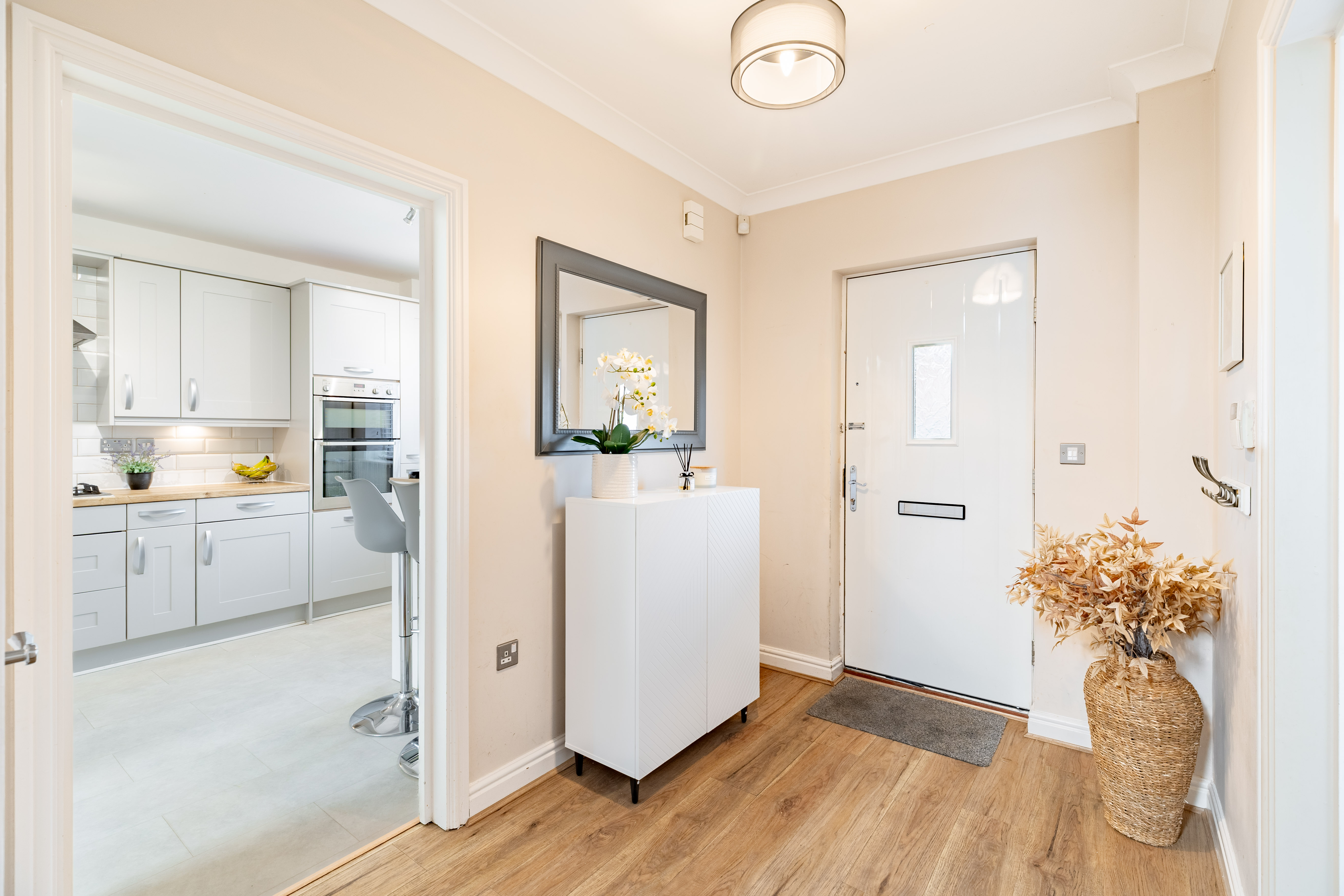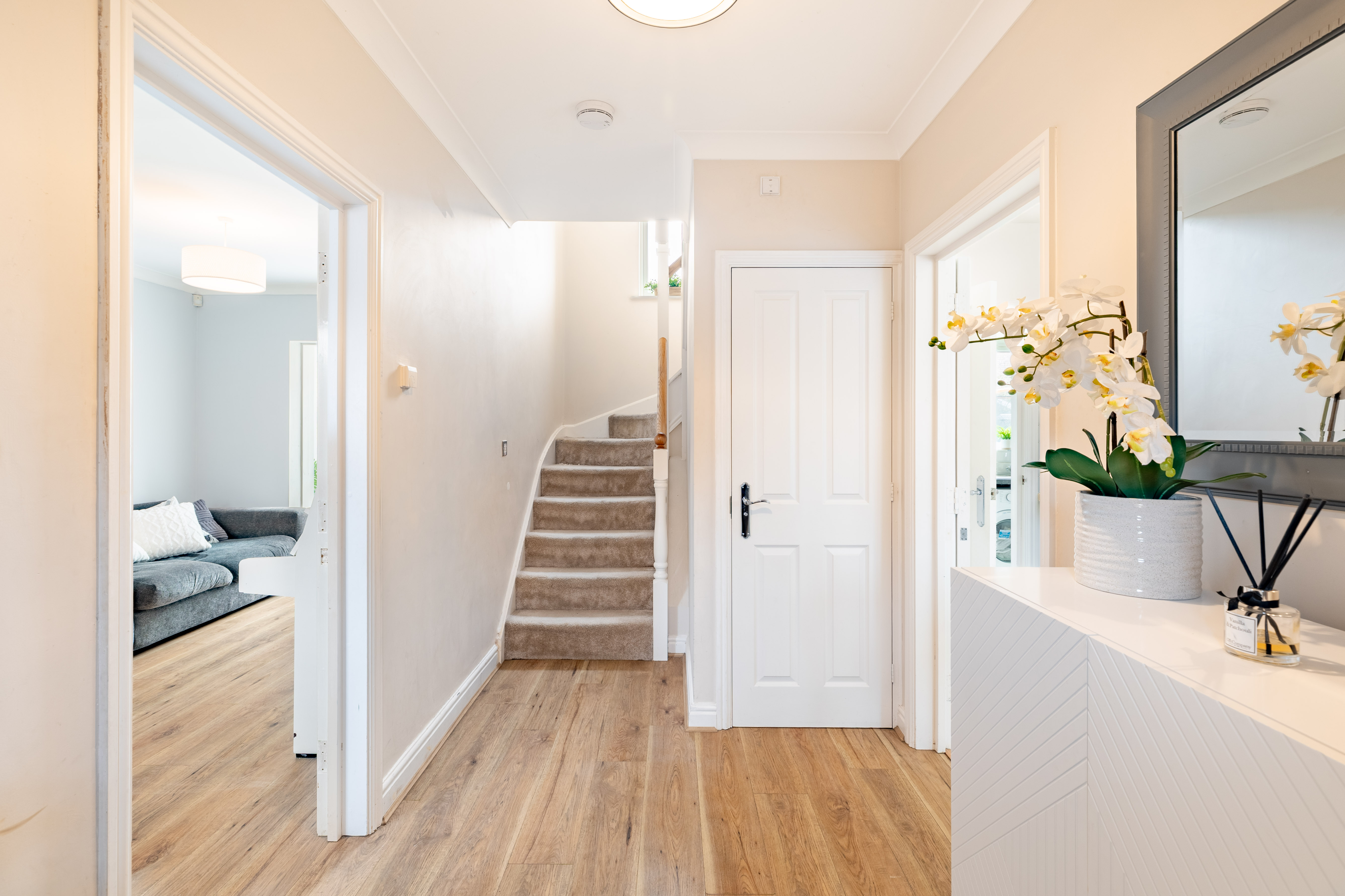 The home opens into a large entrance hall with a convenient WC and stairs to the upper floors. The ground floor reception room is a generous space, offering a comfortable area for family living and relaxation. The kitchen/dining room is fitted with modern integrated appliances, ample storage, and space for everyday dining. A separate utility room offers additional storage and convenience for everyday living. A particular highlight of the property is the conservatory/garden room, which extends from the reception room and provides a bright, versatile space that works well as a playroom, additional dining area, or simply a peaceful spot to enjoy garden views.
