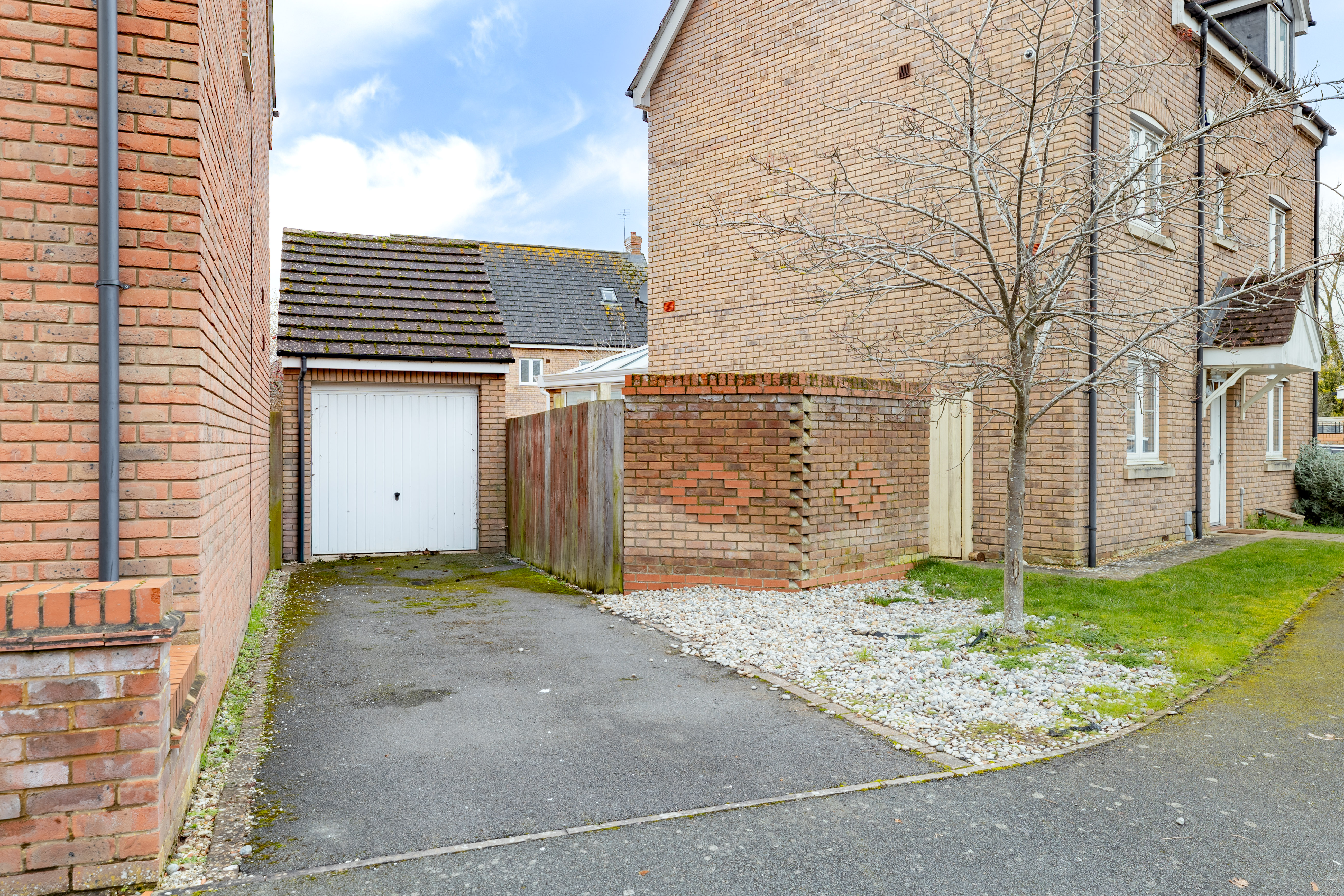 The south-facing rear garden is a well-maintained space, featuring a patio area perfect for outdoor dining and a lawn extending beyond. The garden benefits from sun throughout the day and offers a relatively private setting, ideal for family activities and relaxation. The front of the property provides off-road parking and a single garage for secure parking or additional storage space.