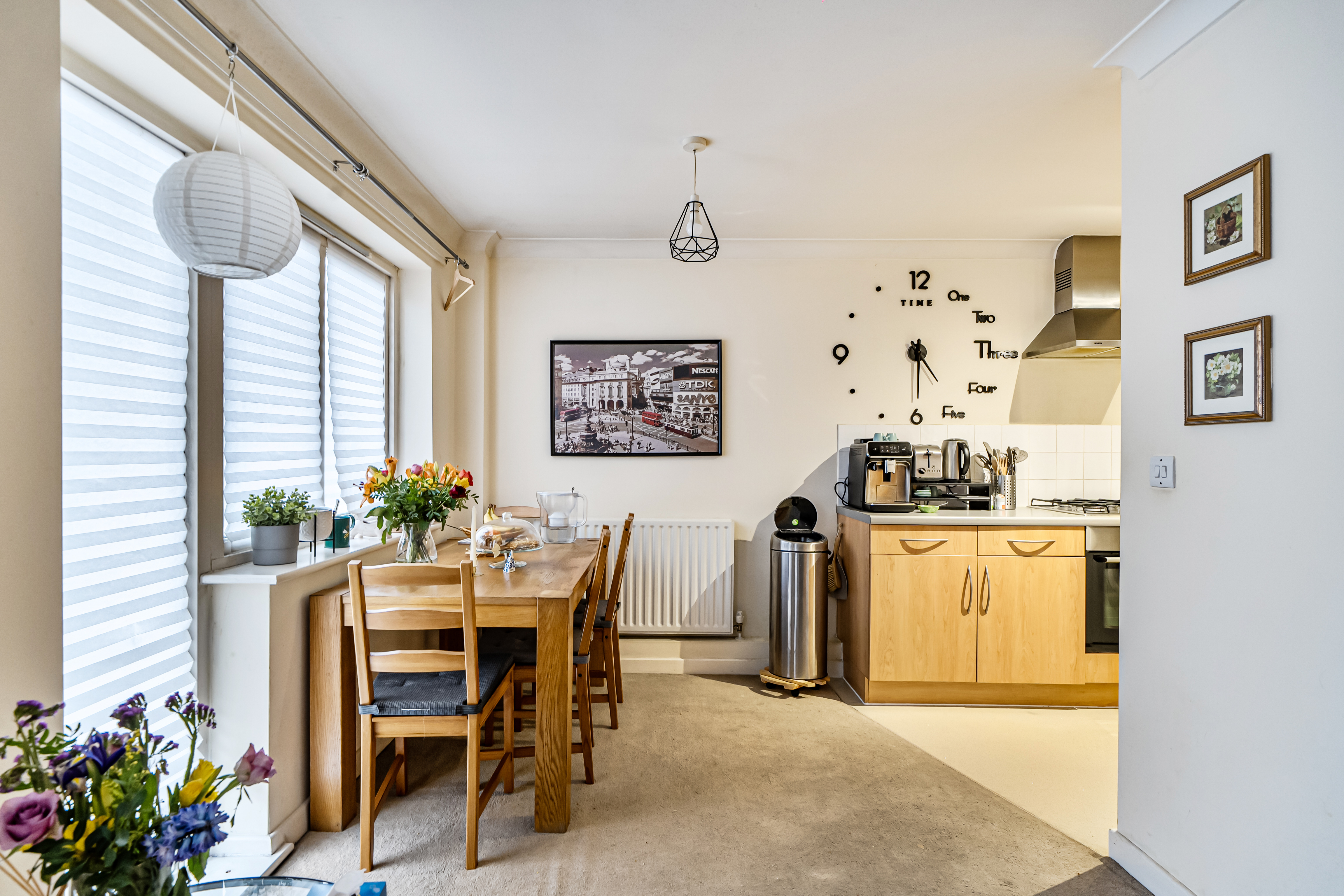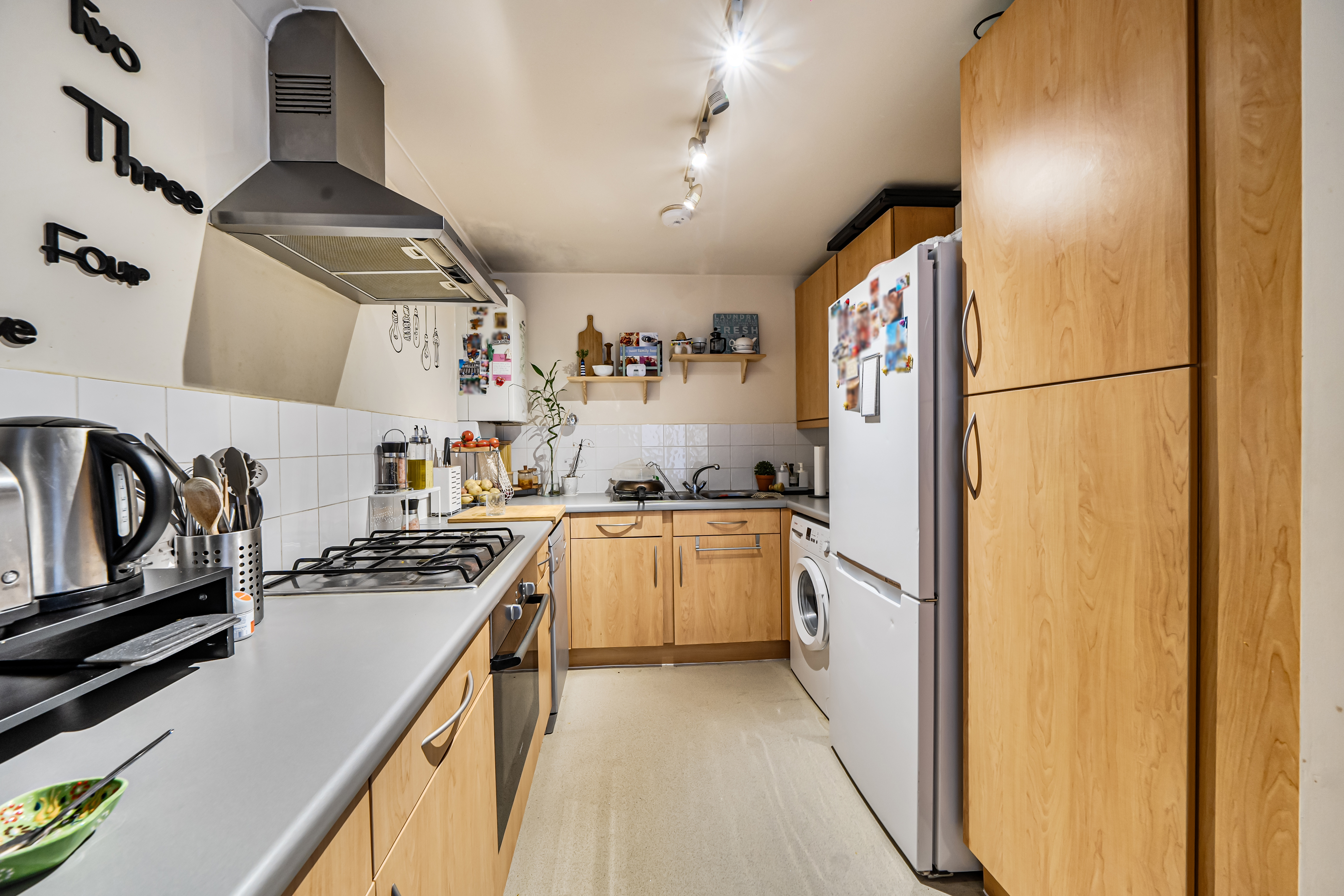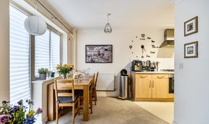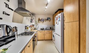 The property features a generous open-plan kitchen and reception area, offering excellent natural light and ample space for both living and dining. The kitchen is fitted with a range of wall and base units, an integrated oven and gas hob, and space for additional appliances.