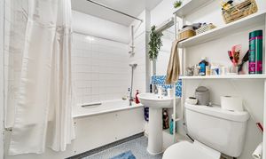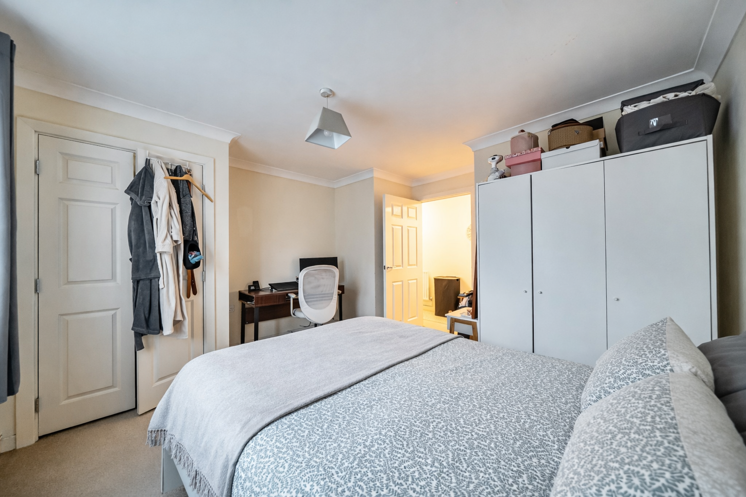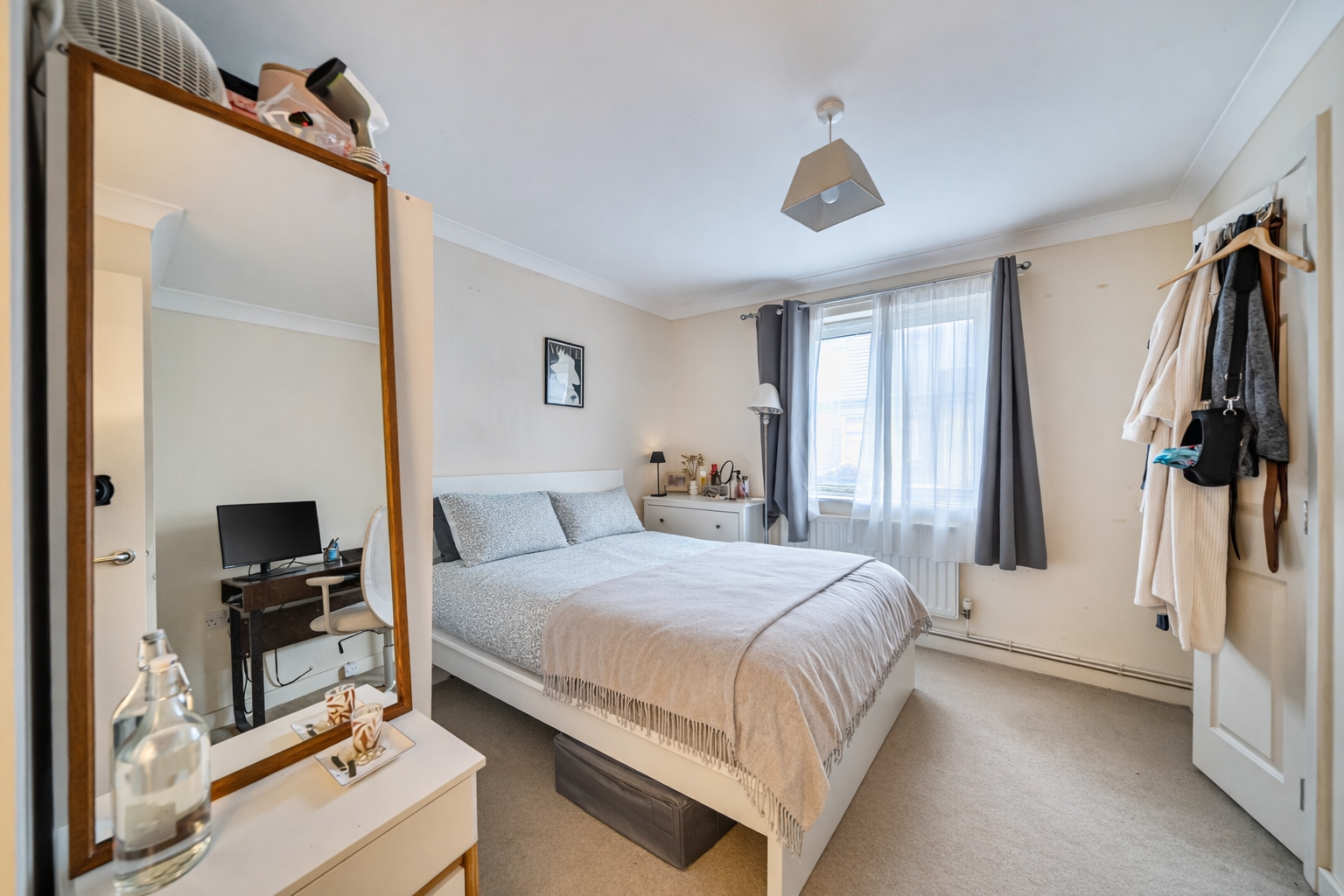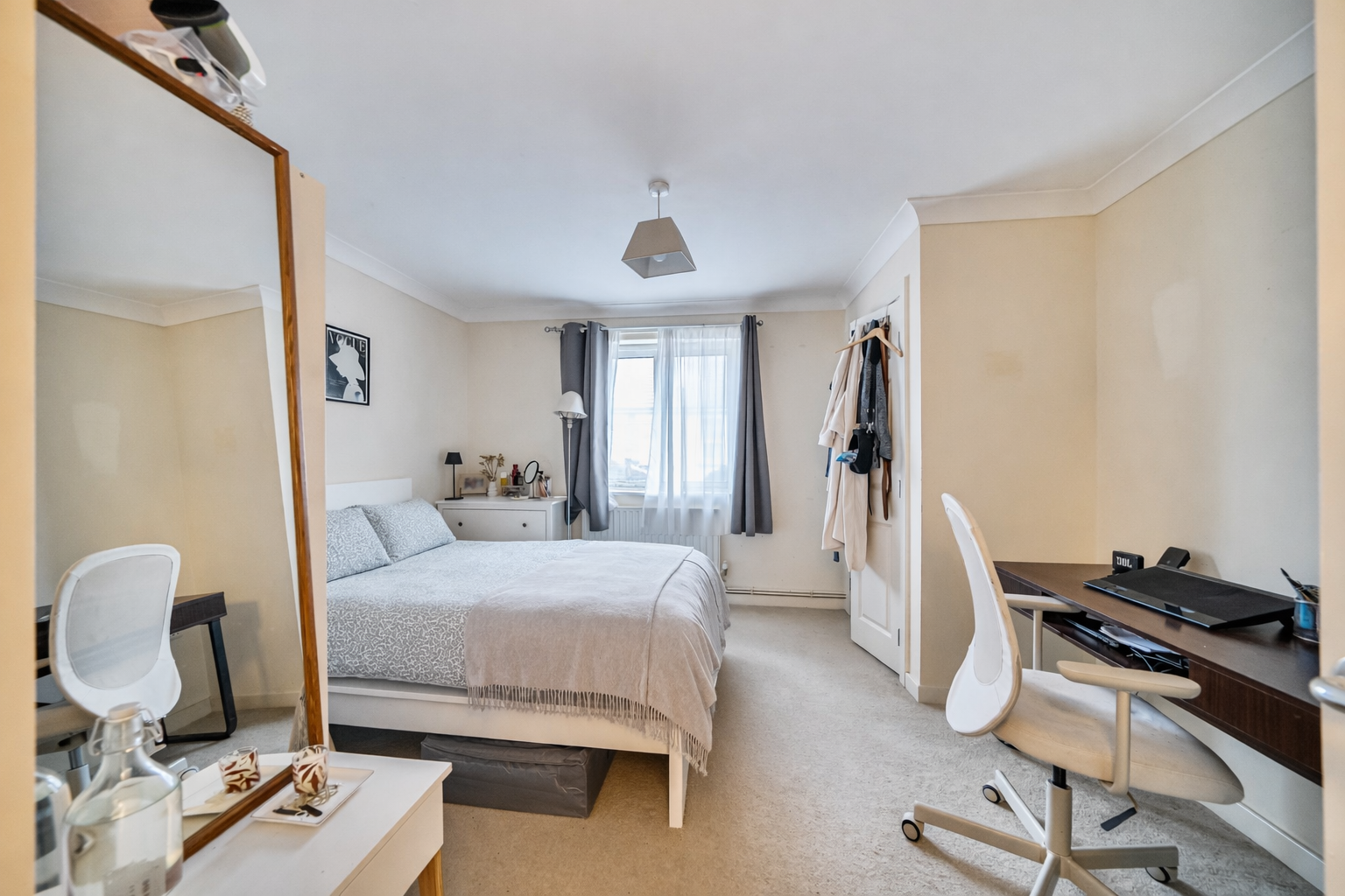 The double bedroom is well-sized and bright, while the bathroom is finished in a clean, neutral style with a full-sized bath and overhead shower.