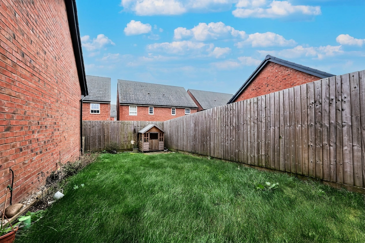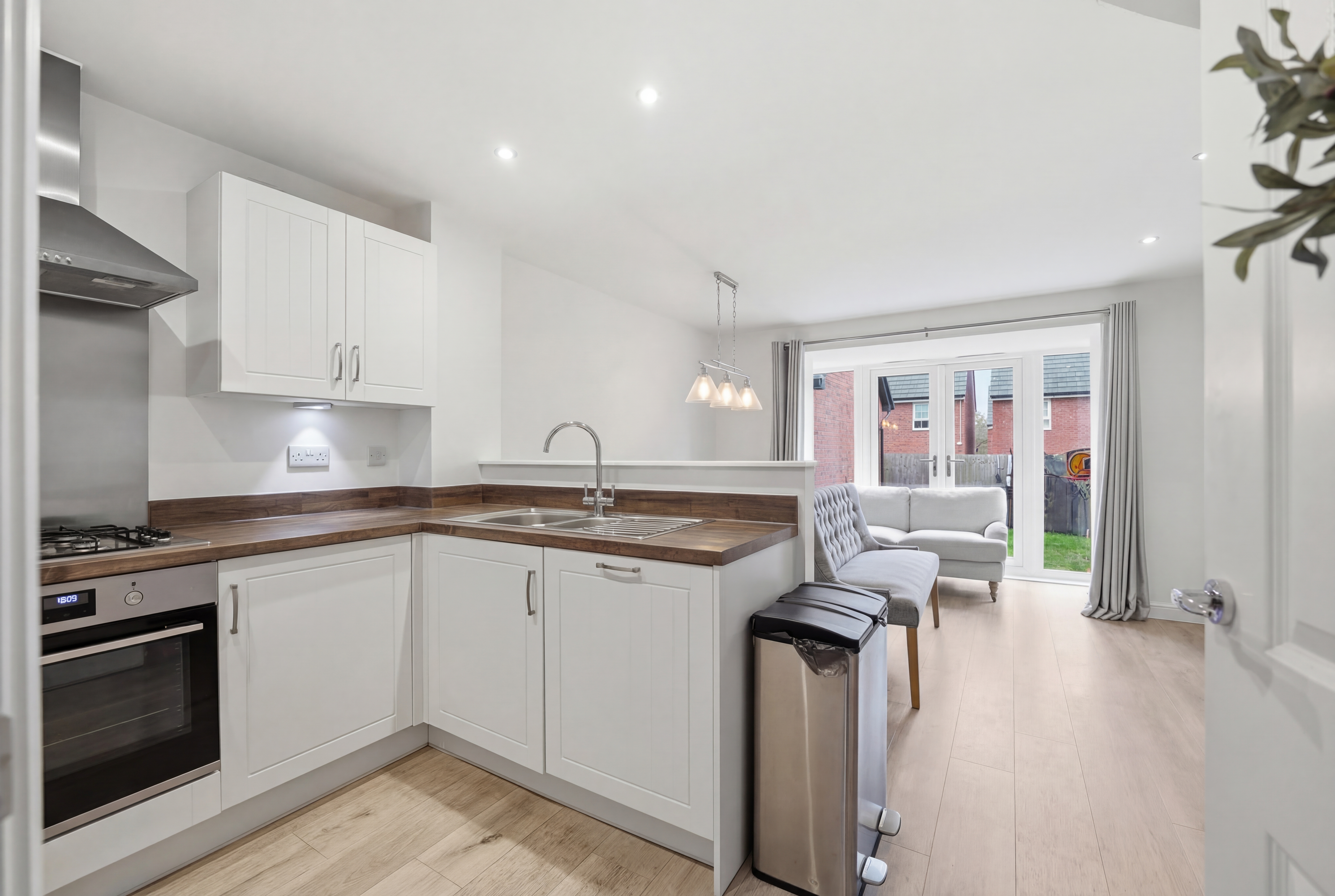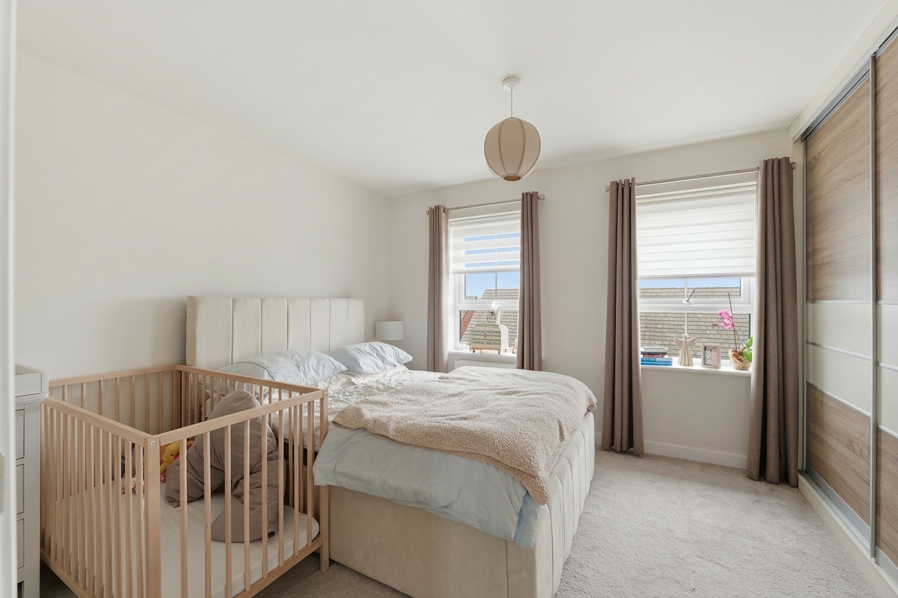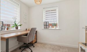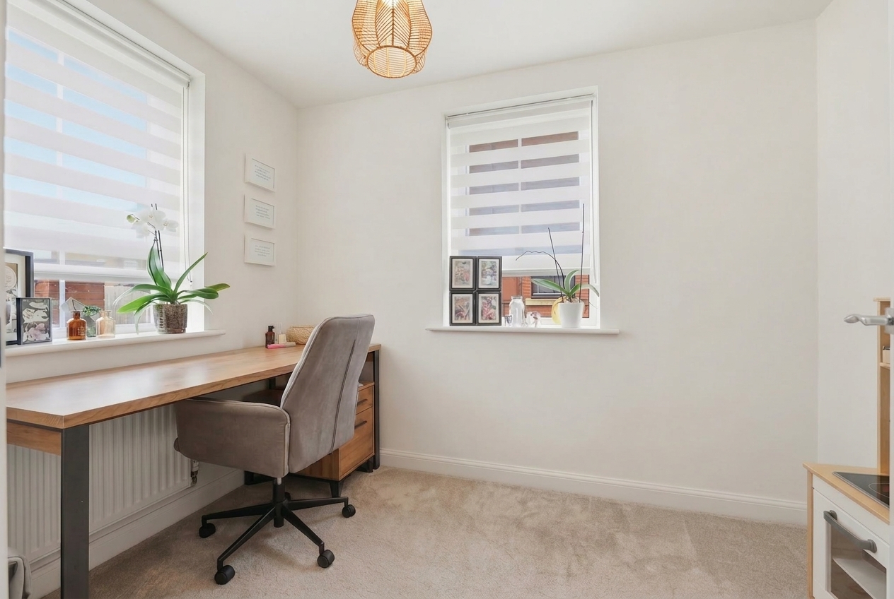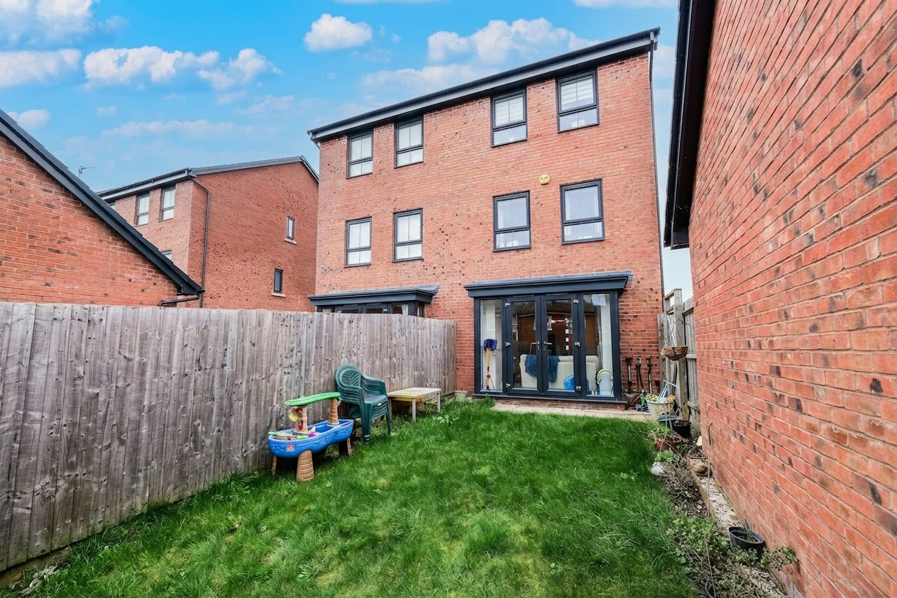 Inside, the property features a stunning open-plan living area that seamlessly connects the kitchen, dining, and living spaces. The modern kitchen is equipped with a range of modern wall and base units, integrated appliances (including an oven and gas hob), and warm wood effect countertops. French doors from the living/dining area open directly onto a well-maintained lawned garden, perfect for entertaining or relaxing outdoors. Upstairs, you’ll find four generous bedrooms, each filled with natural light, plush carpeting, and some bedrooms have built-in wardrobes for ample storage. The home also benefits from a dedicated home office space to the ground floor, ideal for remote work or study. Two stylish bathrooms provide both a modern walk-in shower (to the en-suite) and a bath (to the family bathroom) with contemporary fixtures.