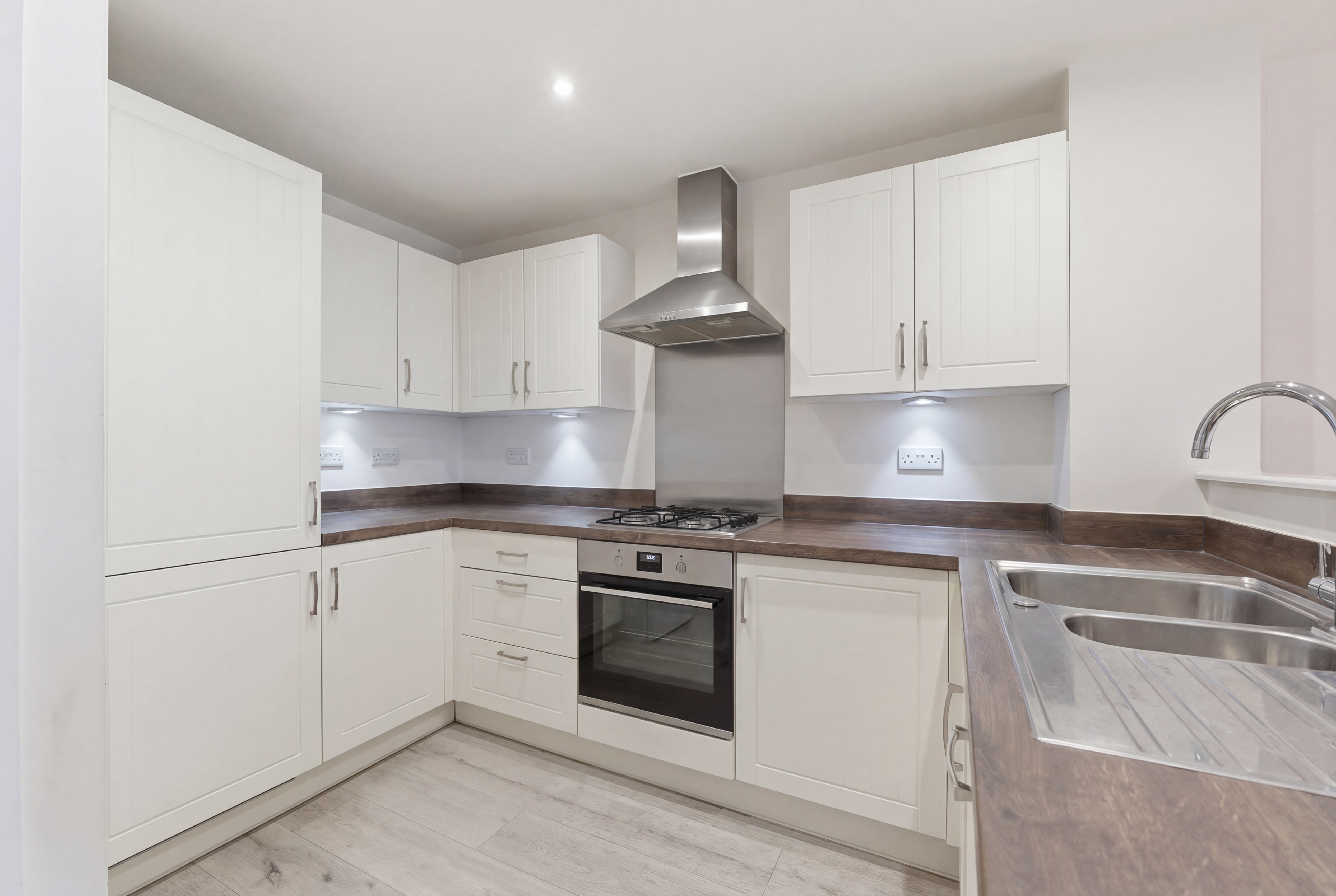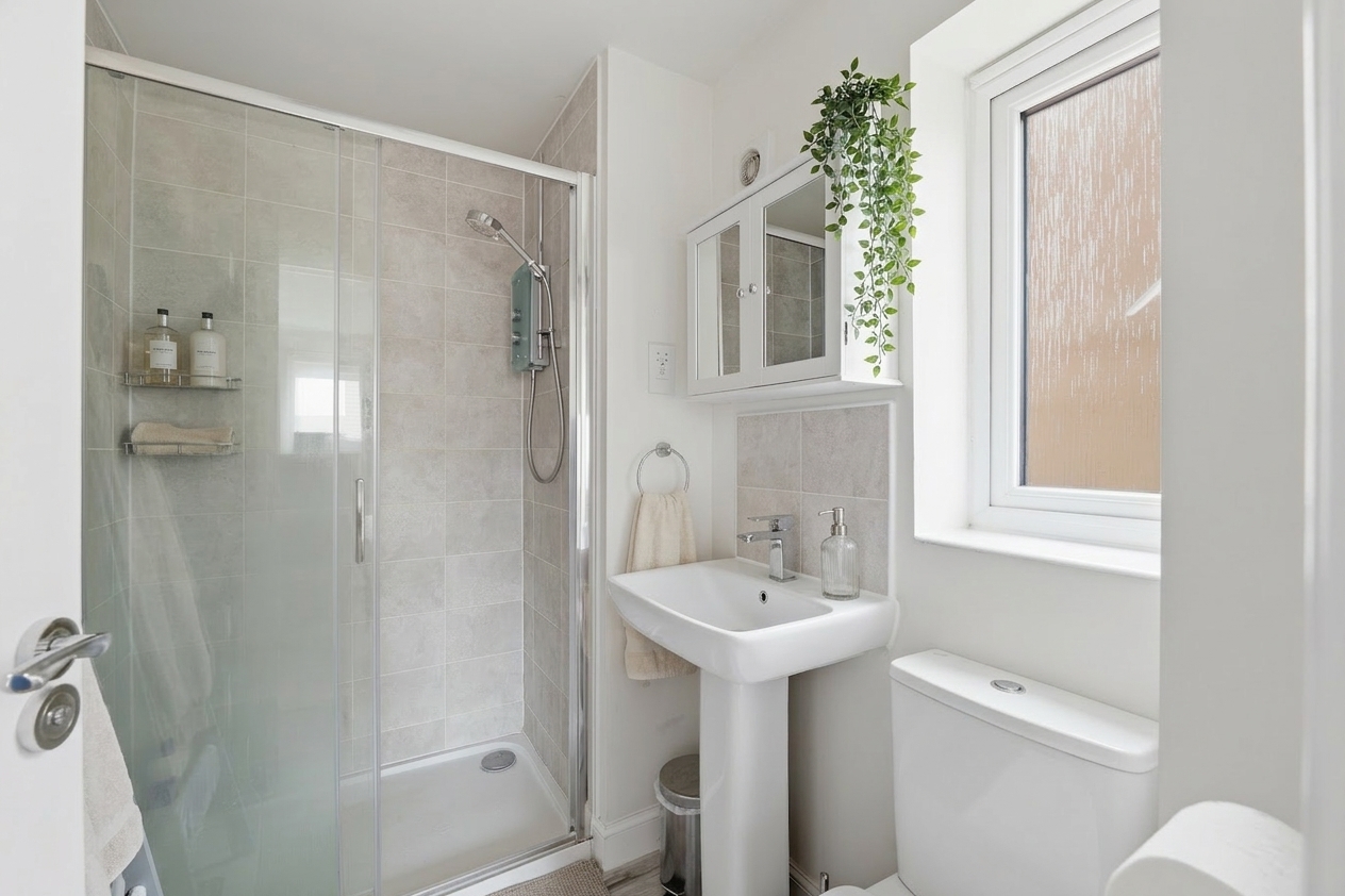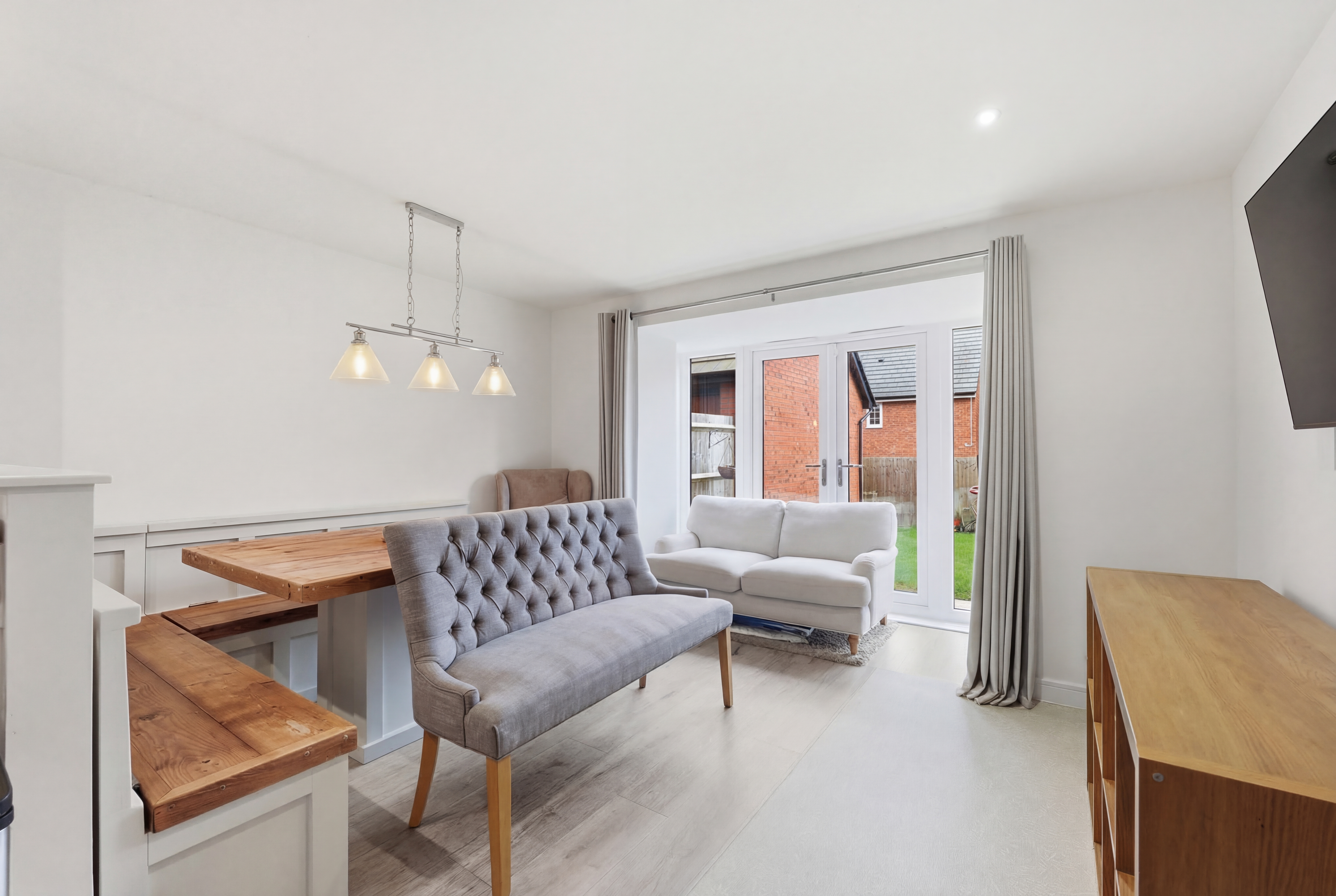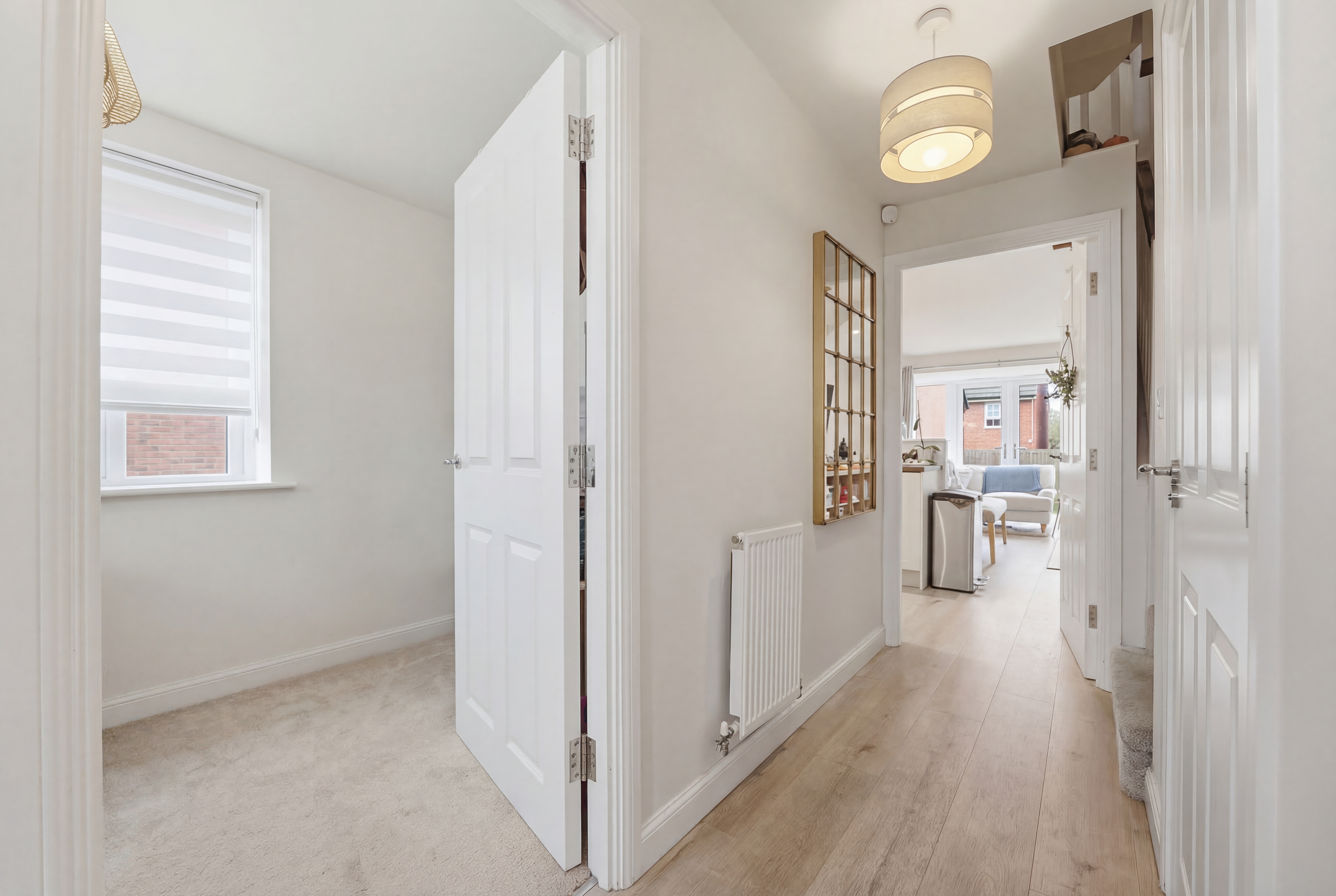 Inside, the property features a stunning open-plan living area that seamlessly connects the kitchen, dining, and living spaces. The modern kitchen is equipped with a range of modern wall and base units, integrated appliances (including an oven and gas hob), and warm wood effect countertops. French doors from the living/dining area open directly onto a well-maintained lawned garden, perfect for entertaining or relaxing outdoors. Upstairs, you’ll find four generous bedrooms, each filled with natural light, plush carpeting, and some bedrooms have built-in wardrobes for ample storage. The home also benefits from a dedicated home office space to the ground floor, ideal for remote work or study. Two stylish bathrooms provide both a modern walk-in shower (to the en-suite) and a bath (to the family bathroom) with contemporary fixtures.