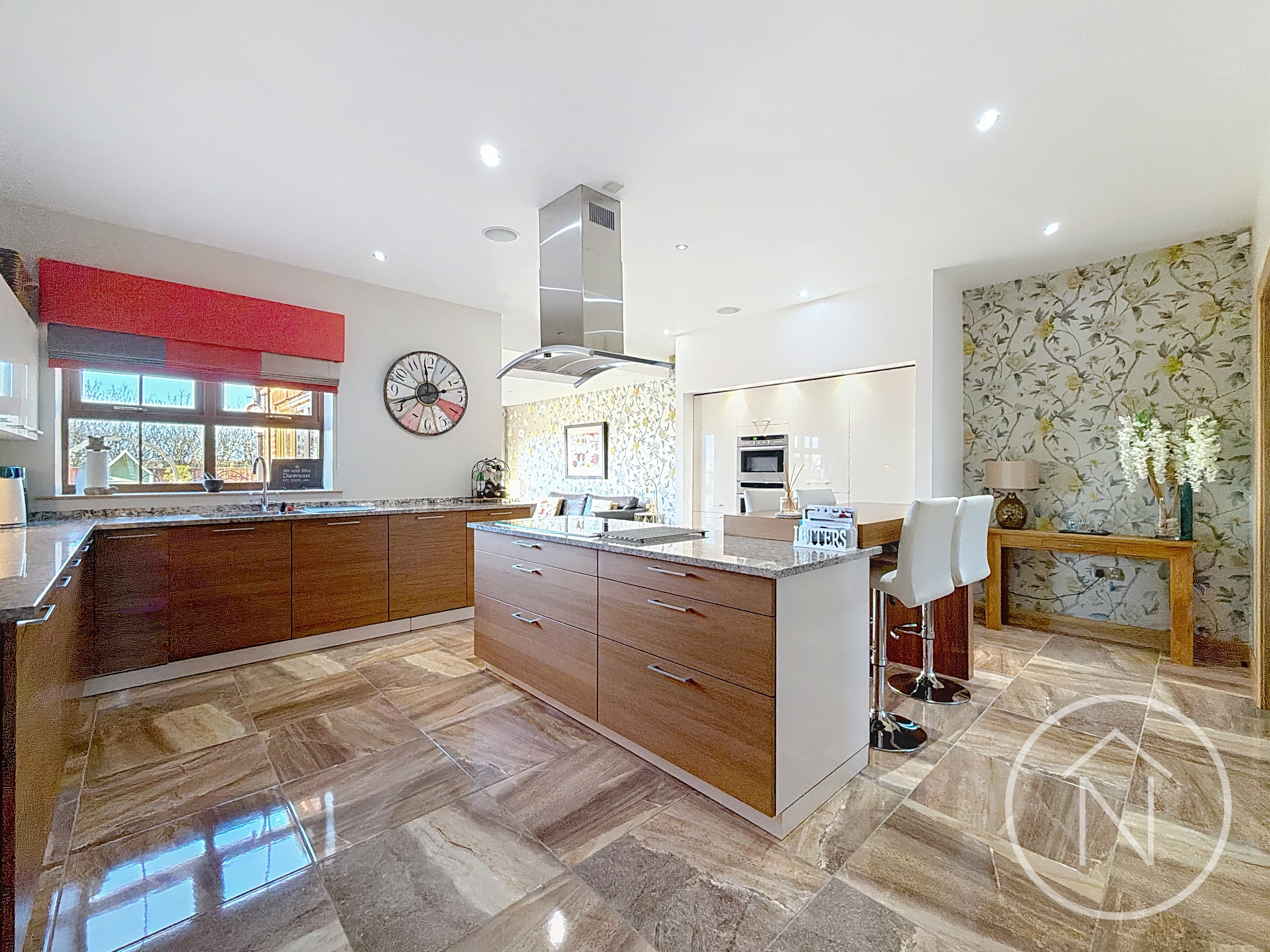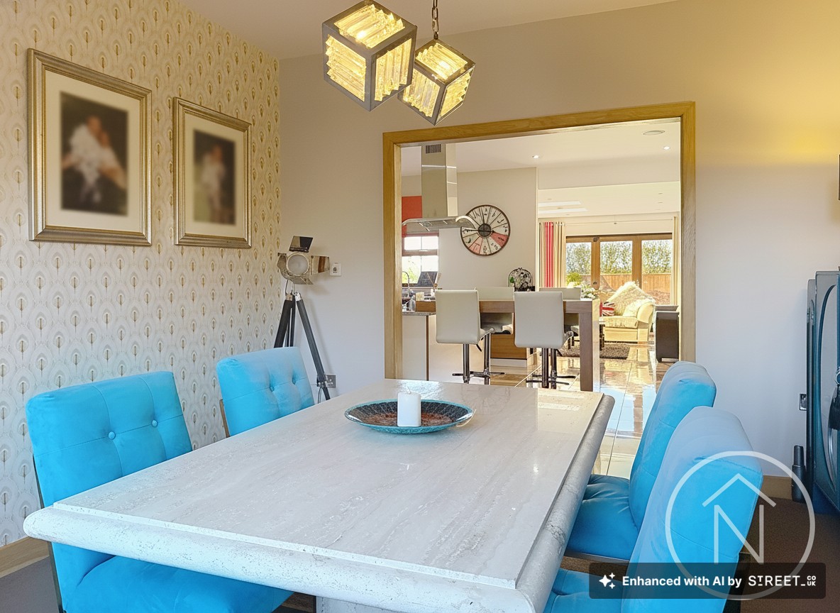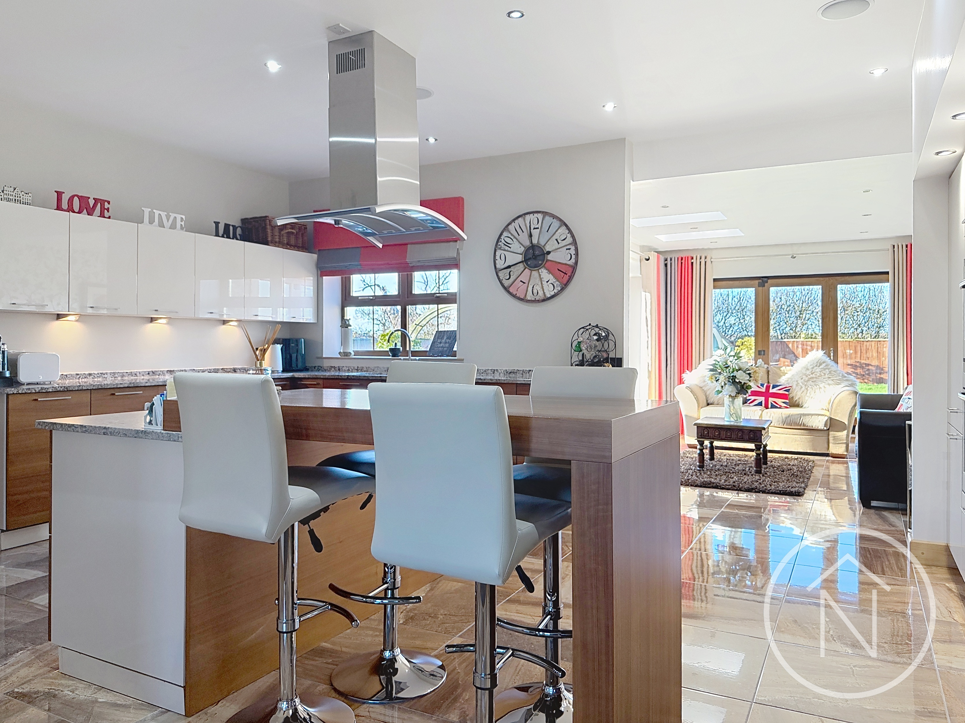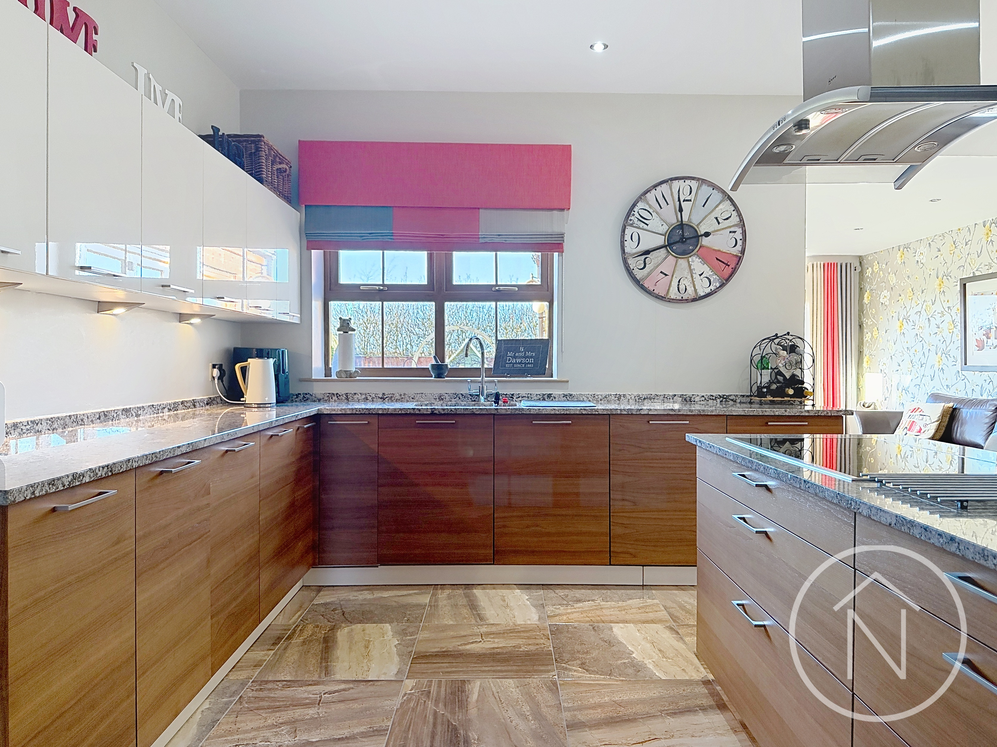 This exceptional six-bedroom, four-bathroom detached home located in Wolviston Village, epitomises modern family living, blending generous proportions with exquisite contemporary design. Across its three impressive storeys, the home offers five versatile reception rooms, each thoughtfully crafted to maximise comfort, style, and abundant natural light. The inviting entrance hall sets a sophisticated tone with polished tile flooring, a striking wooden staircase, and elegant chandelier lighting. The heart of the home is the stunning open-plan kitchen and living area, featuring sleek kitchen units, granite countertops, integrated appliances, and a central island with a breakfast bar. Seamless indoor-outdoor living is achieved through bi-fold doors that connect the principal rooms to an expansive, well-maintained garden and patio spaces, ideal for entertaining and family gatherings.