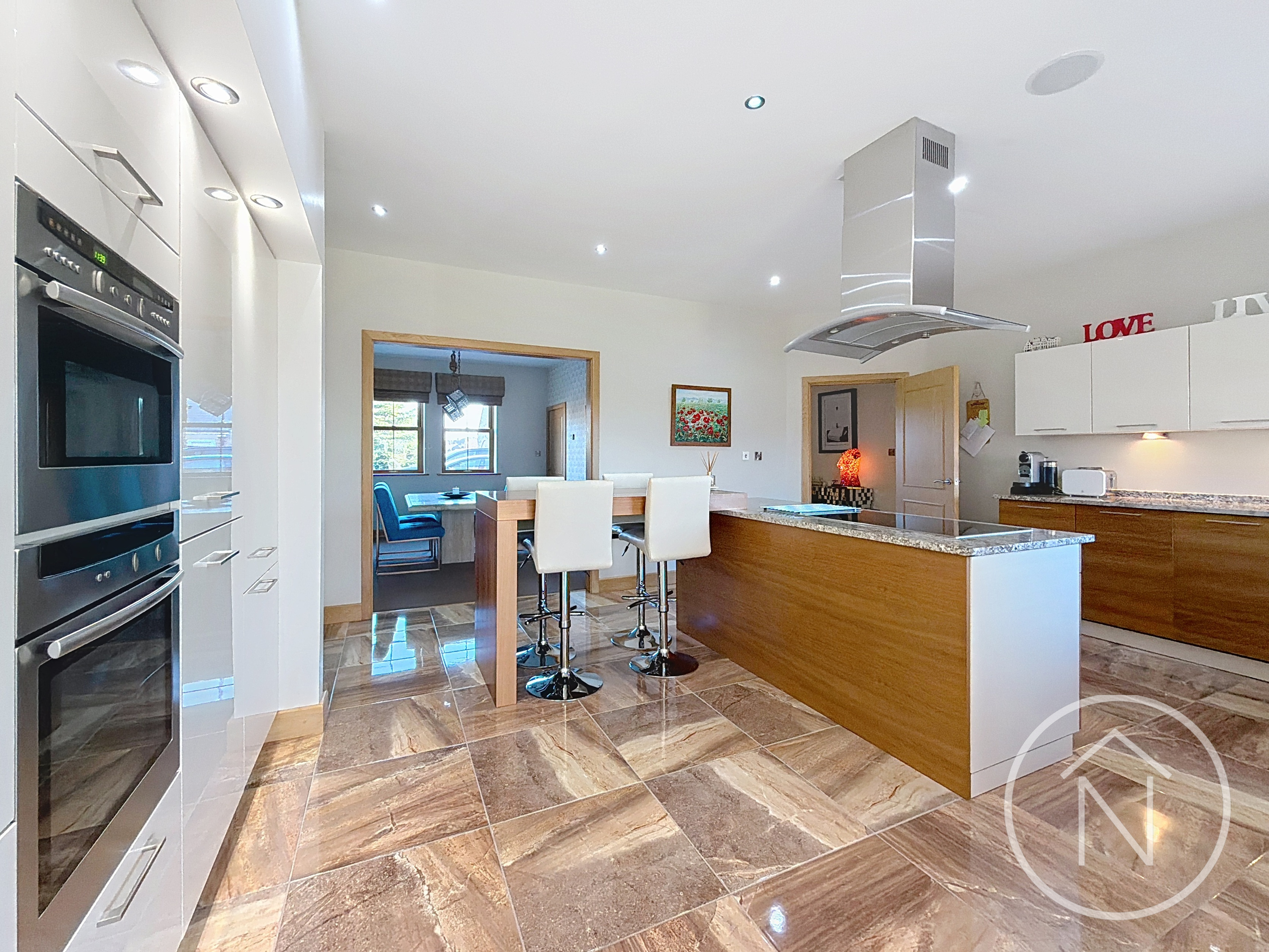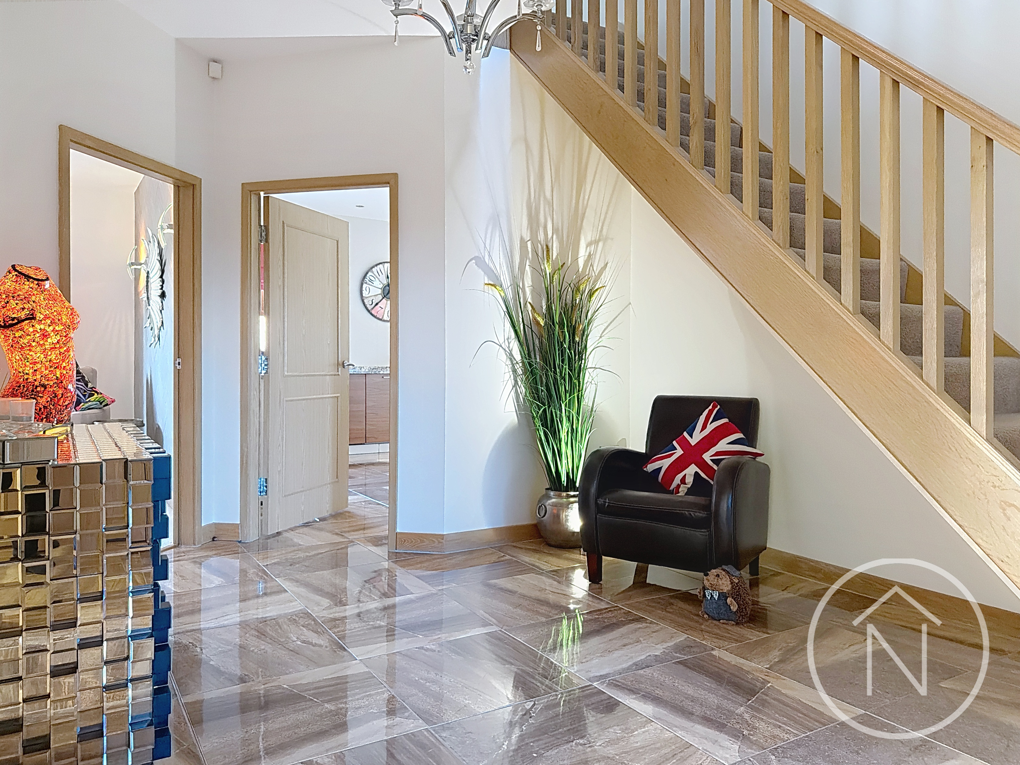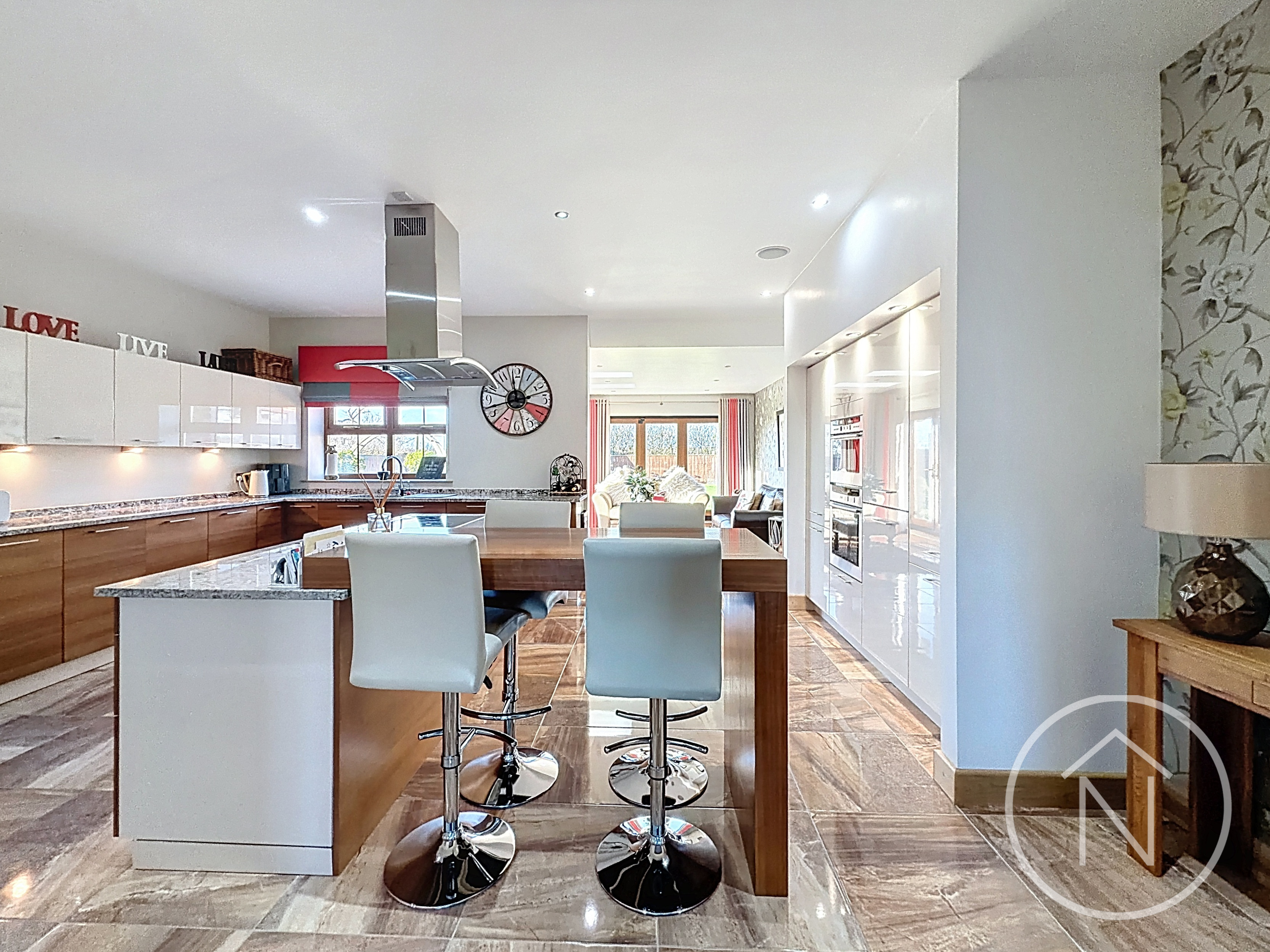 This exceptional six-bedroom, four-bathroom detached home located in Wolviston Village, epitomises modern family living, blending generous proportions with exquisite contemporary design. Across its three impressive storeys, the home offers five versatile reception rooms, each thoughtfully crafted to maximise comfort, style, and abundant natural light. The inviting entrance hall sets a sophisticated tone with polished tile flooring, a striking wooden staircase, and elegant chandelier lighting. The heart of the home is the stunning open-plan kitchen and living area, featuring sleek kitchen units, granite countertops, integrated appliances, and a central island with a breakfast bar. Seamless indoor-outdoor living is achieved through bi-fold doors that connect the principal rooms to an expansive, well-maintained garden and patio spaces, ideal for entertaining and family gatherings.