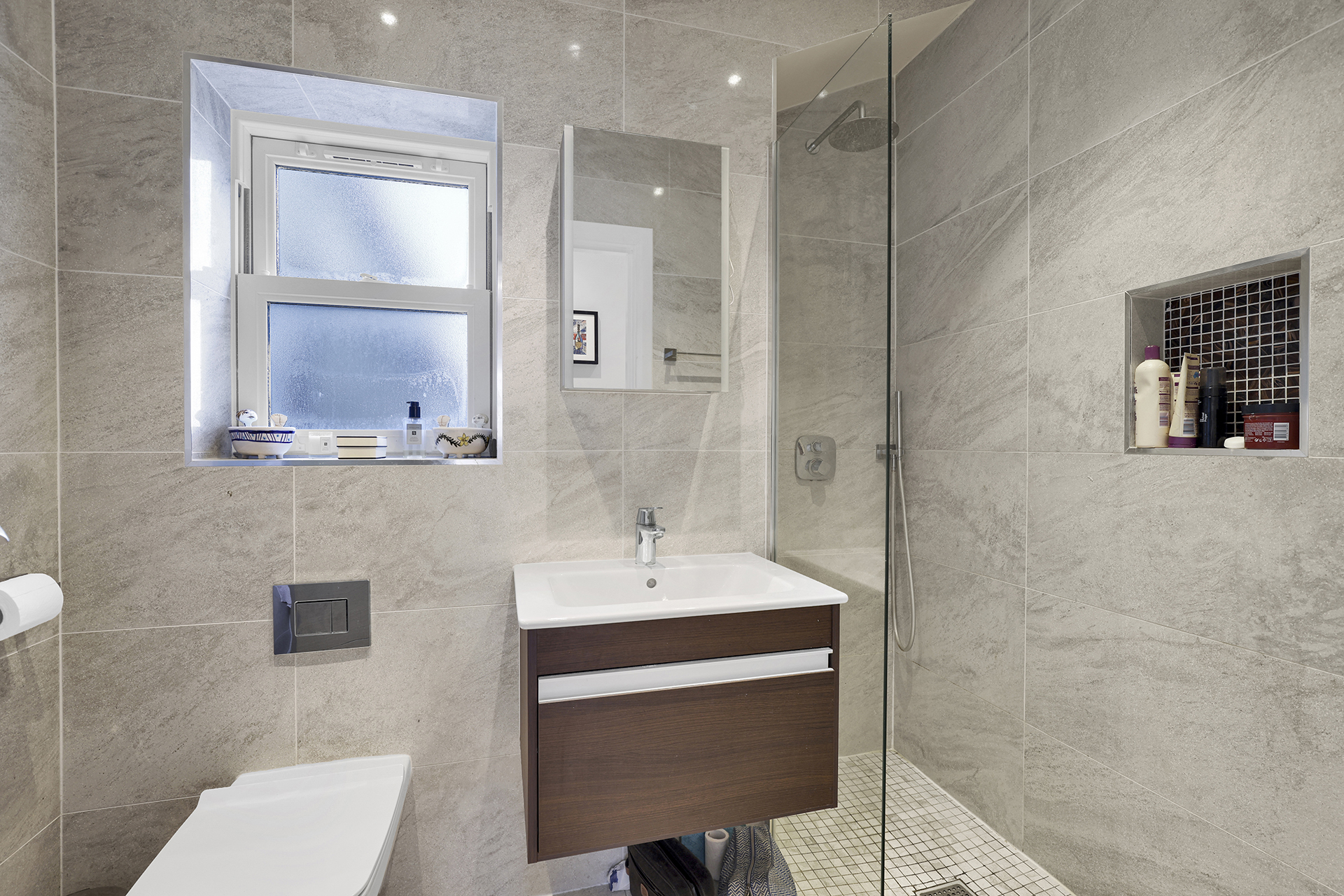 - Modern walk-in shower with niche