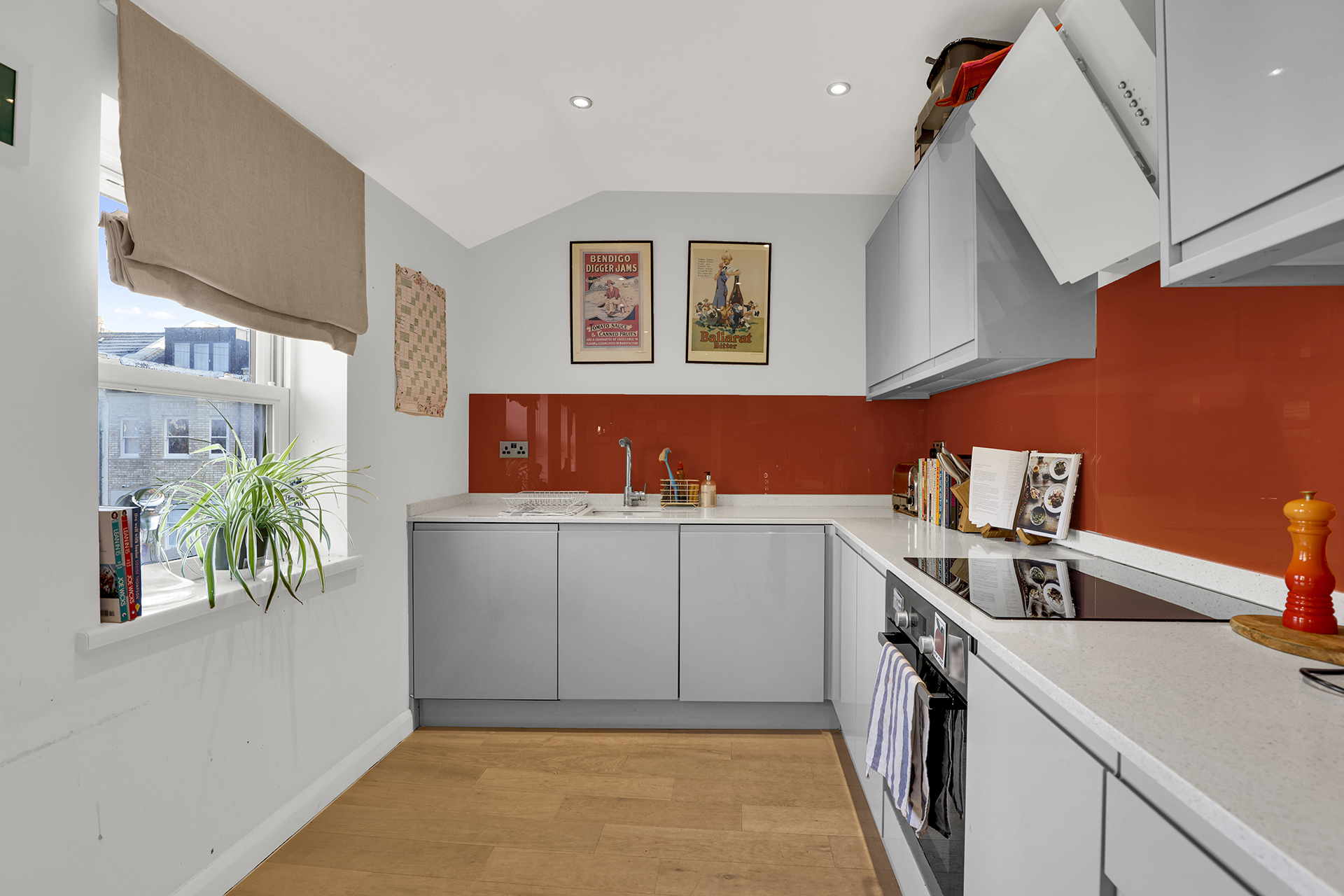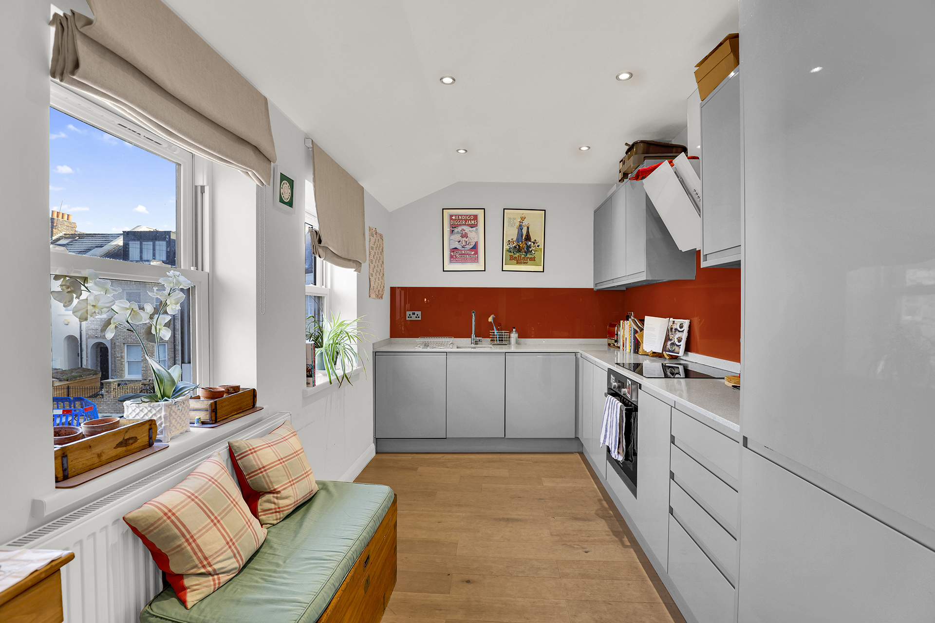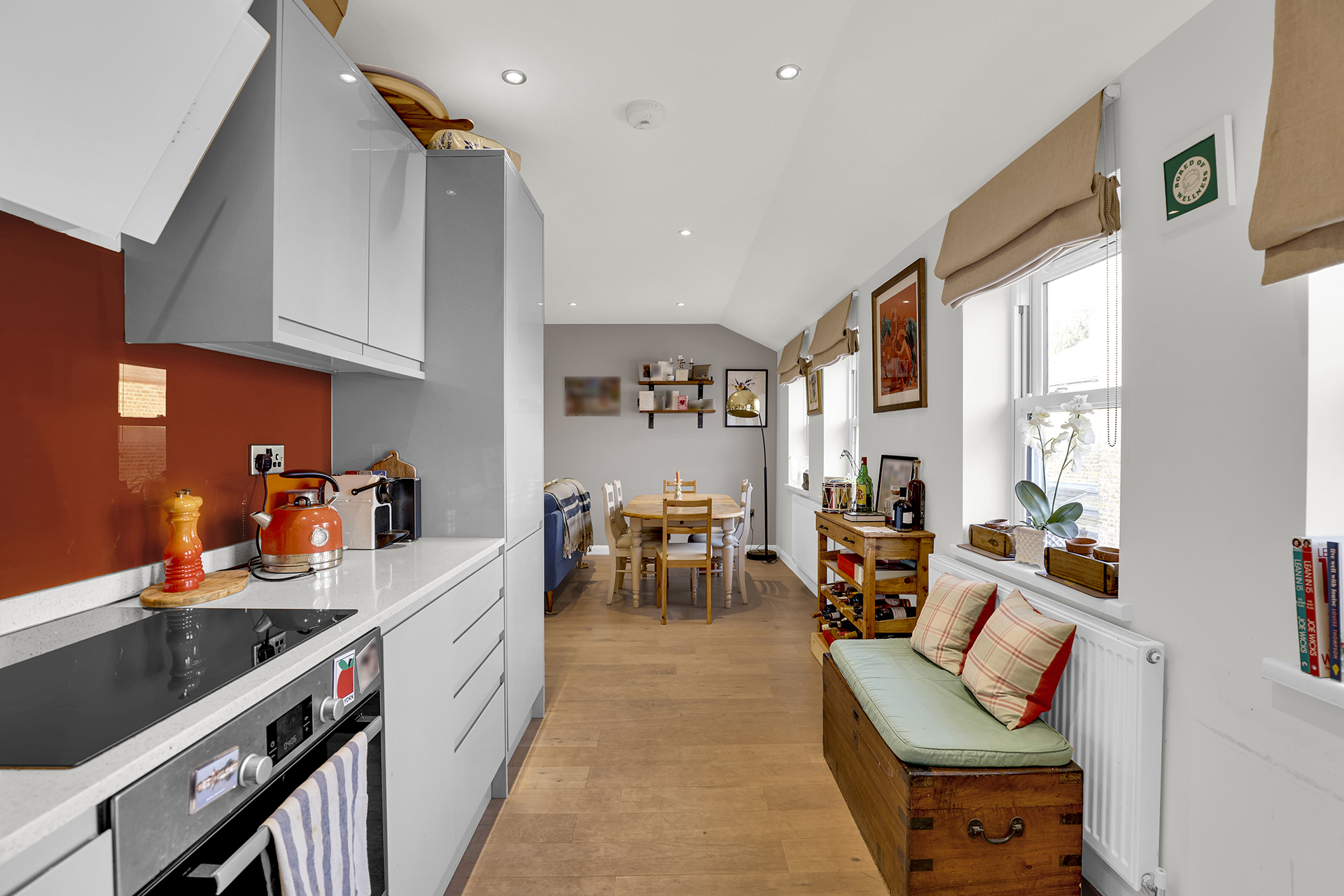 - Stylish orange splashback and fitted Bosch kitchen appliances