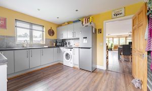 The modern kitchen is well-appointed with a range of fitted units and space for appliances, offering both practicality and style.