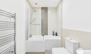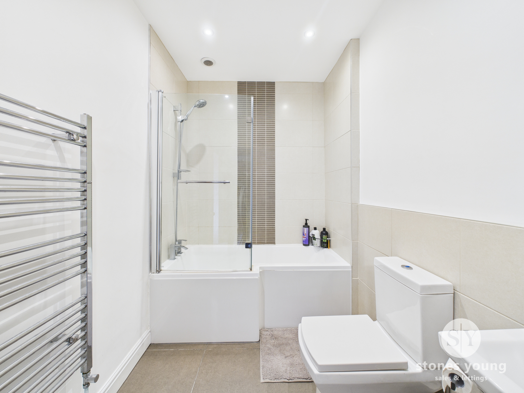 Three-piece suite in white, mains fed shower over bath, tiled floor and 1/2 tiled walls, heated towel radiator, W/C and sink, ceiling spotlights.