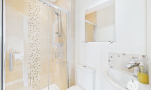Two-piece suite in white, tiled flooring, shower cubicle with mains fed shower, W/C and sink, ceiling spotlights.
